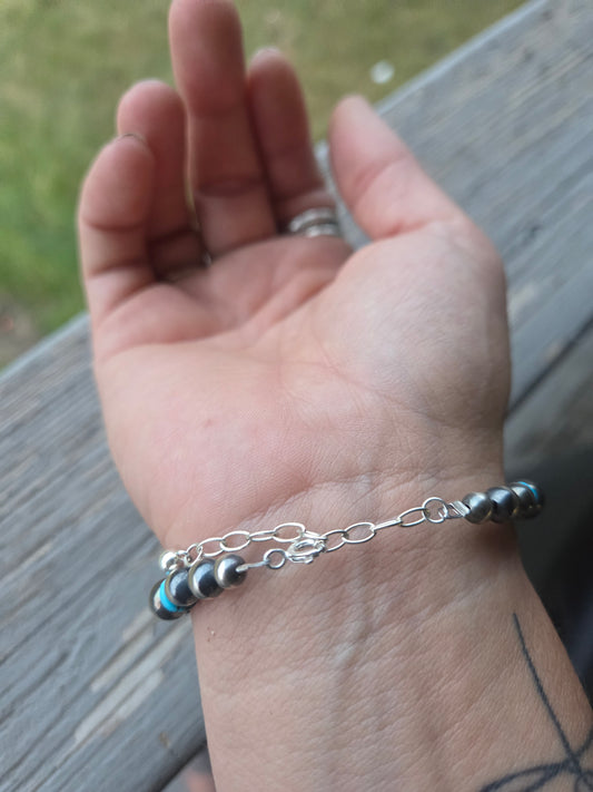 Buffalo Coin•Sterling Silver Navajo Style Pearl • Turquoise Sterling Silver Adjustable clasp. fits size 6.25-8