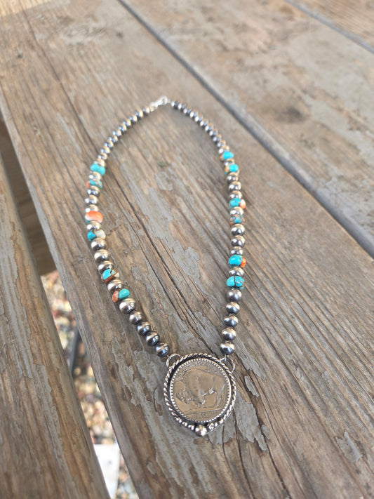 Buffalo Coin• Spiny Oyster Kingsmen Turquoise • Sterling Silver Navajo Style Pearl