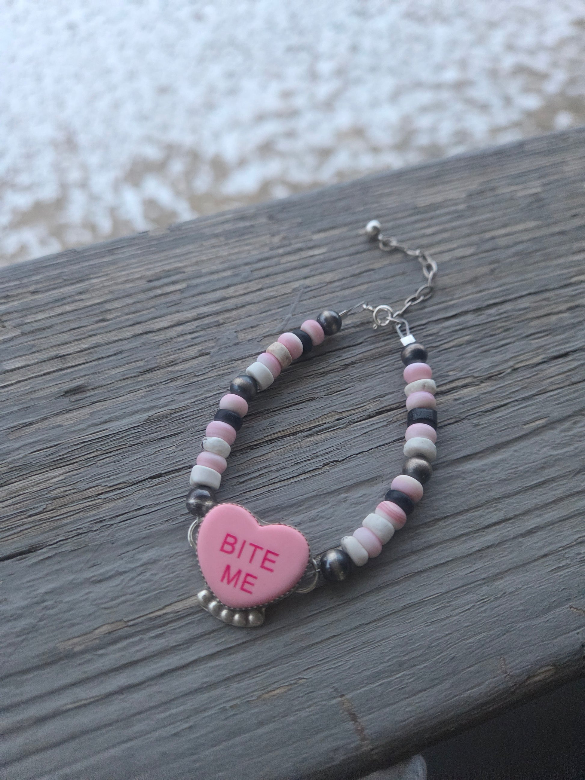Heart Bite Me Resin Cab. Sterling silver Navajo style pearls. Pink Conch Beads. White Buffalo beads. Adjustable