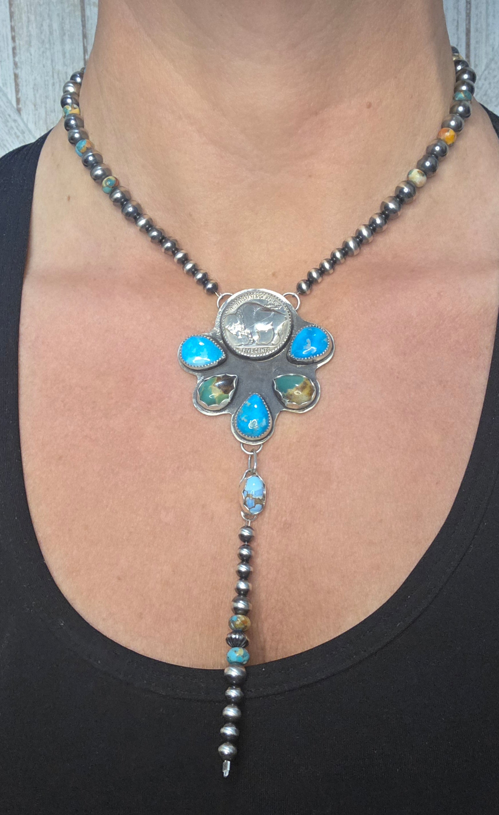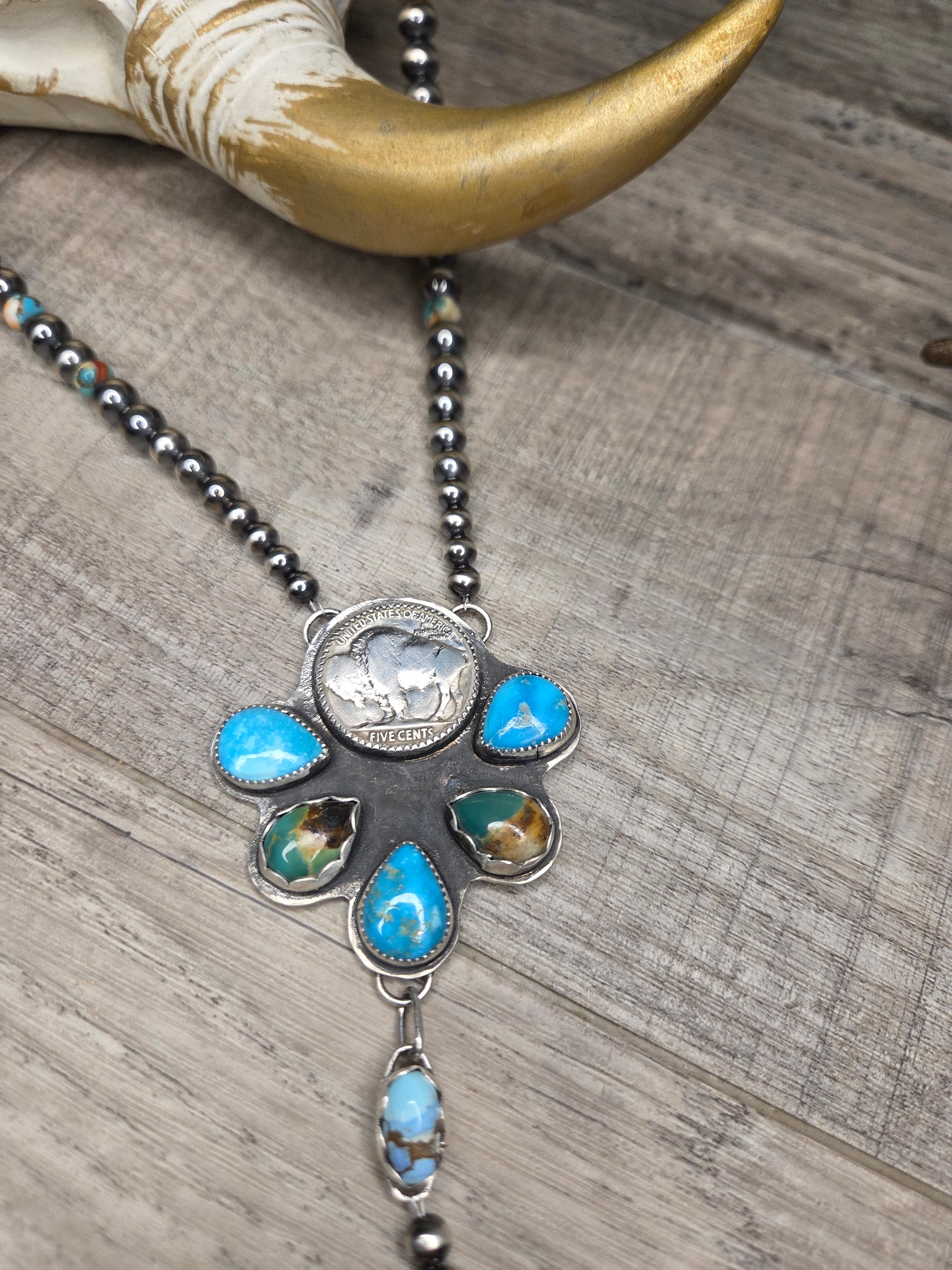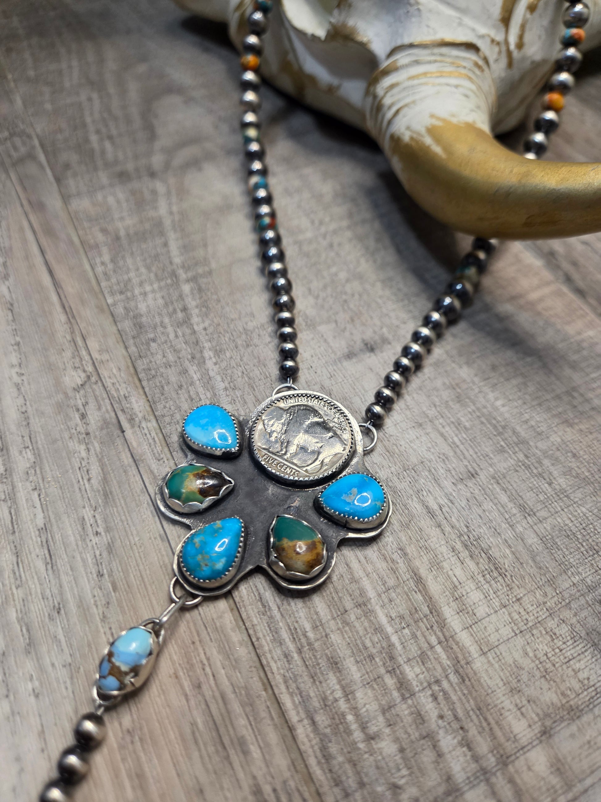 Buffalo Coin• Blue Bird Turquoise • Kingsmen Turquoise • Golden Hills Turquoise. Sterling Pearls & Spiny Oyster Kingsmen