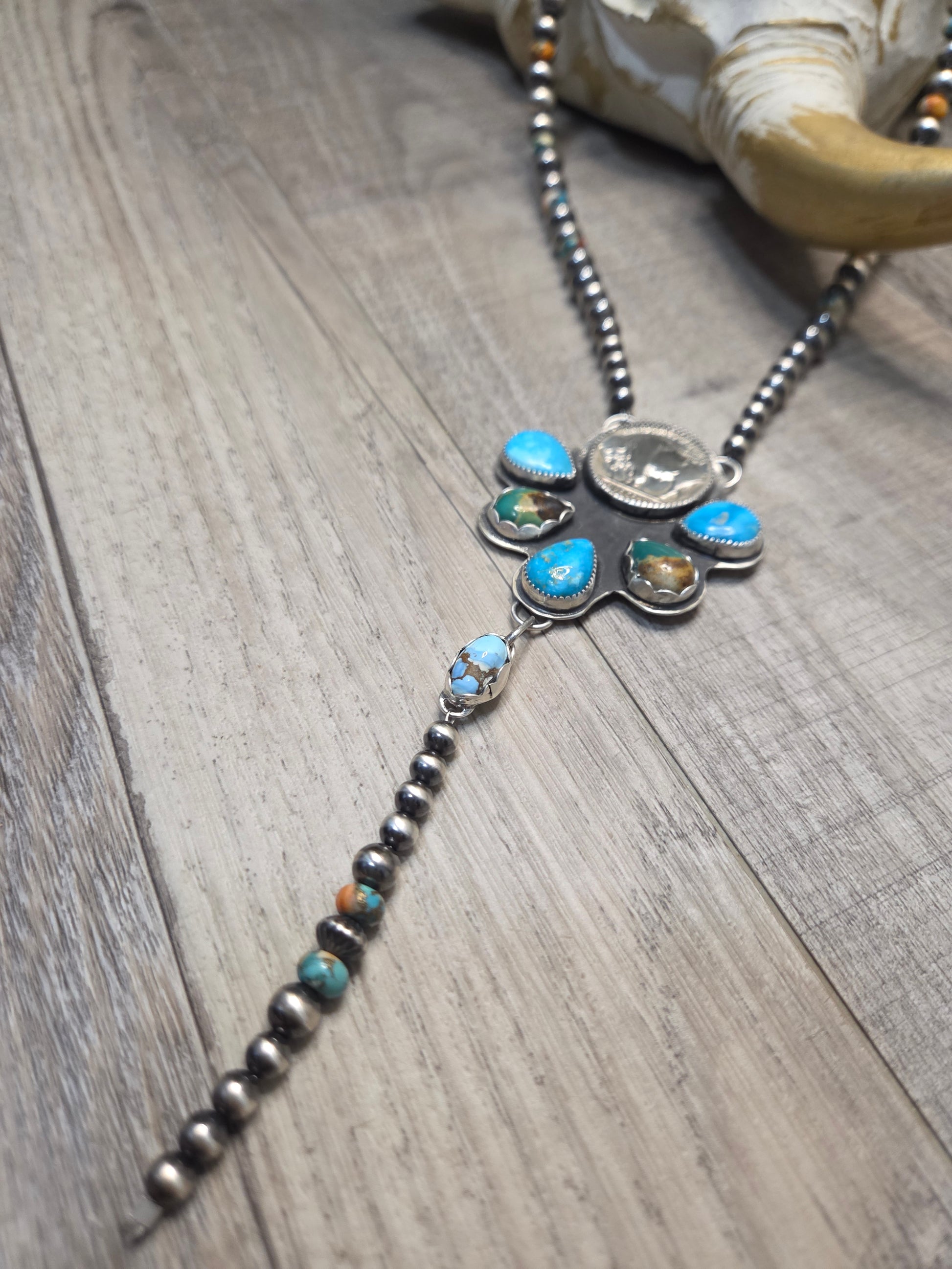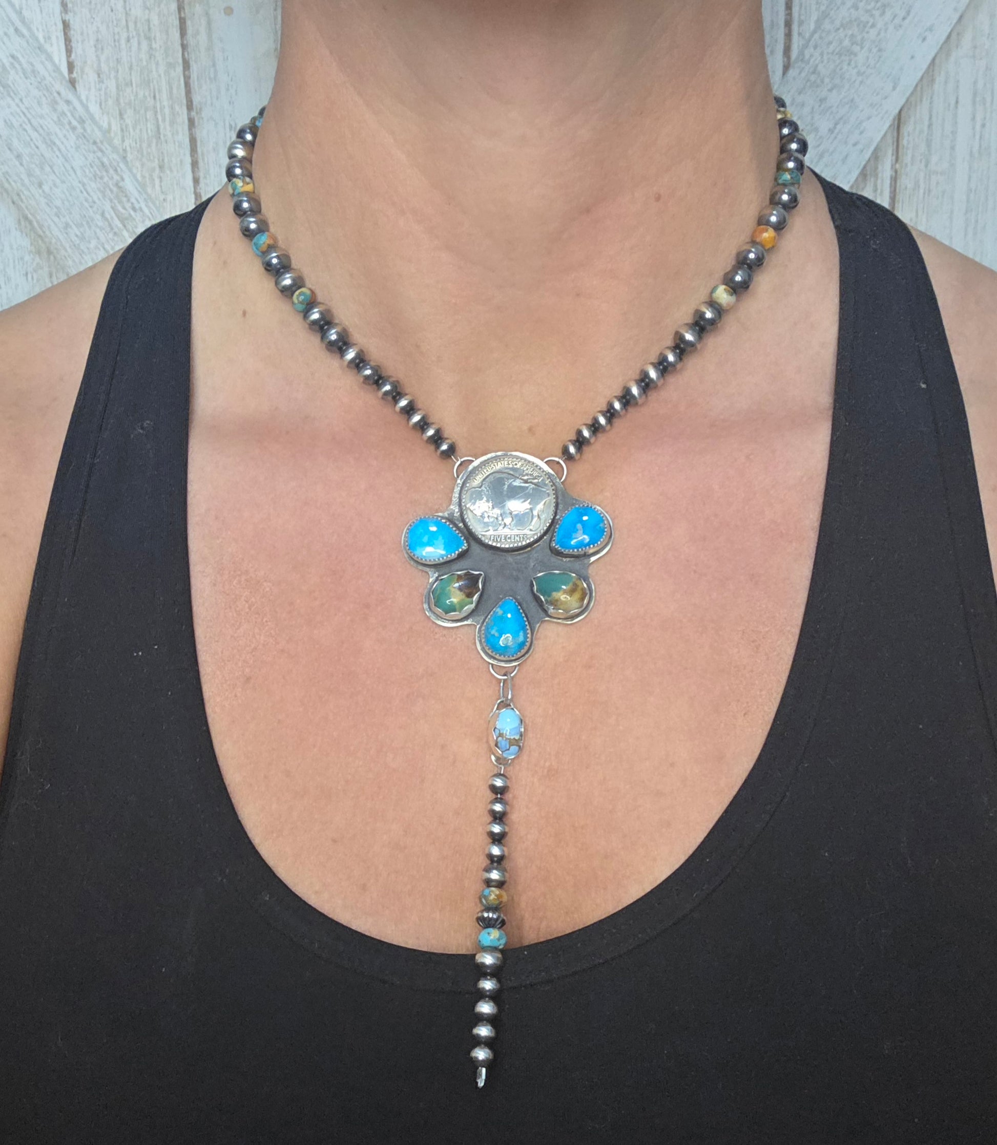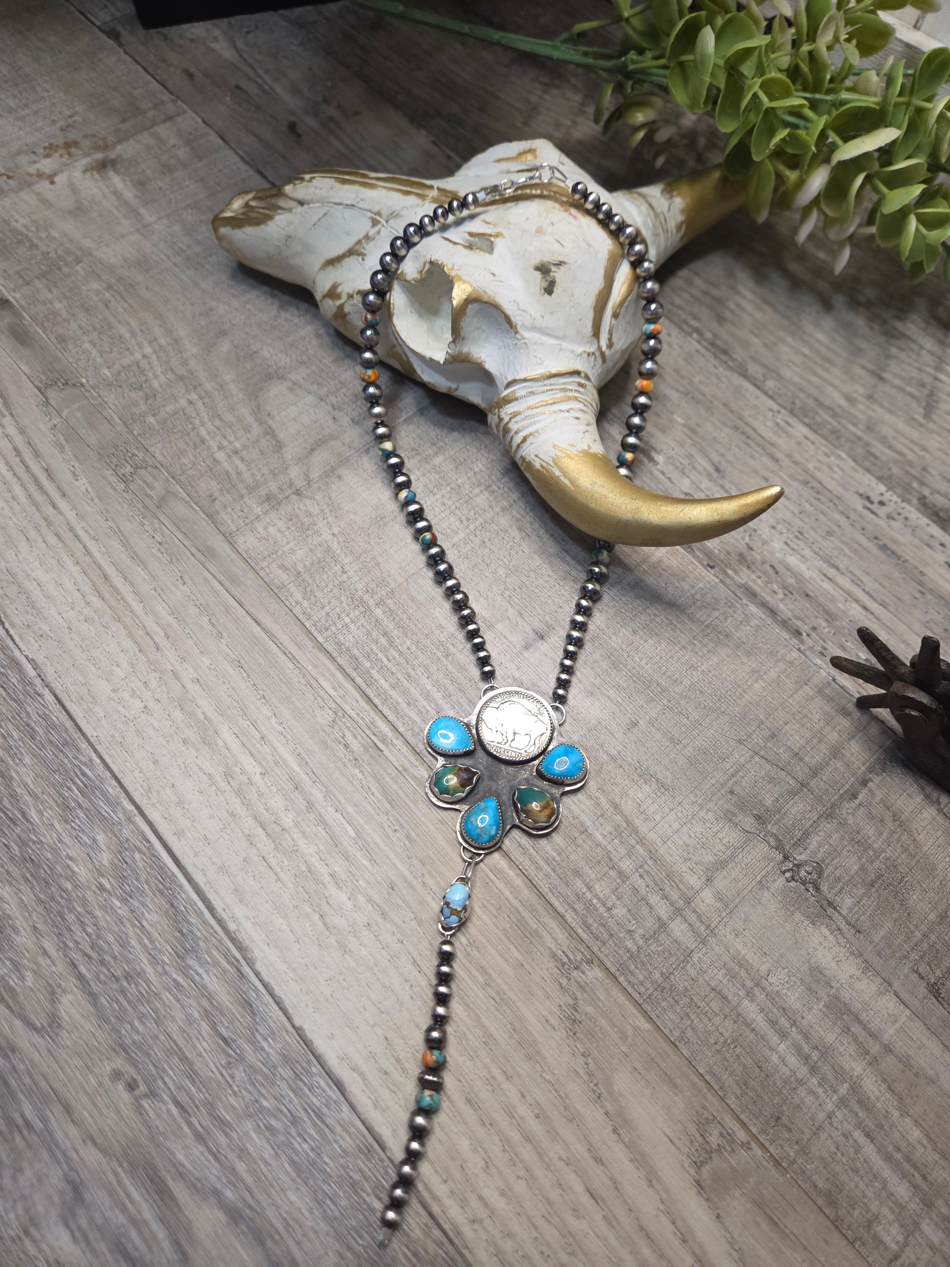 Buffalo Coin• Blue Bird Turquoise • Kingsmen Turquoise • Golden Hills Turquoise. Sterling Pearls & Spiny Oyster Kingsmen