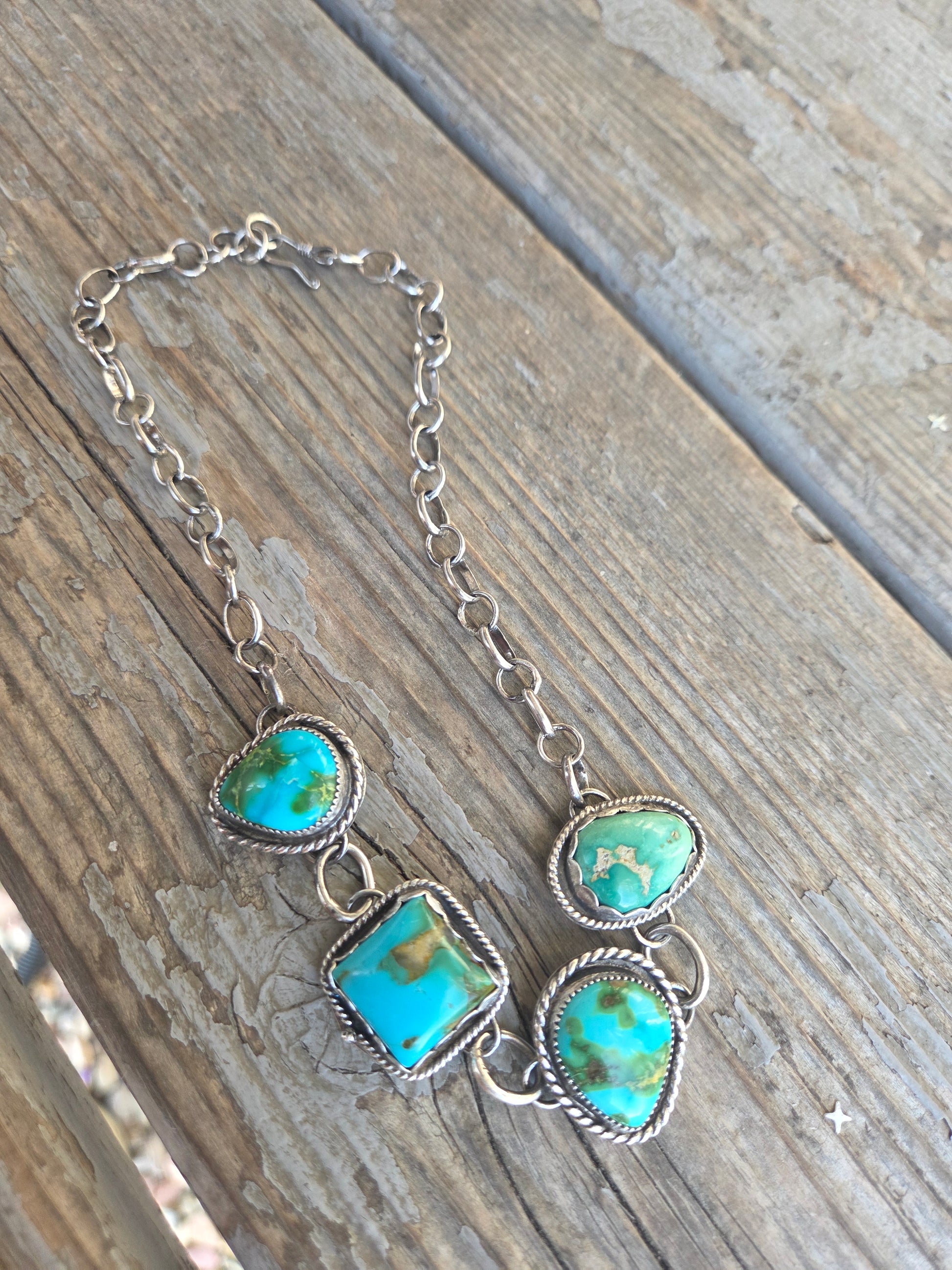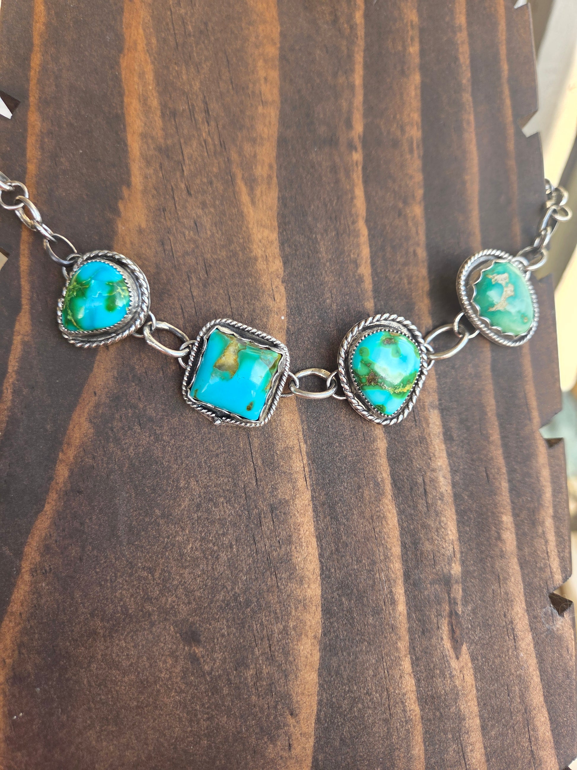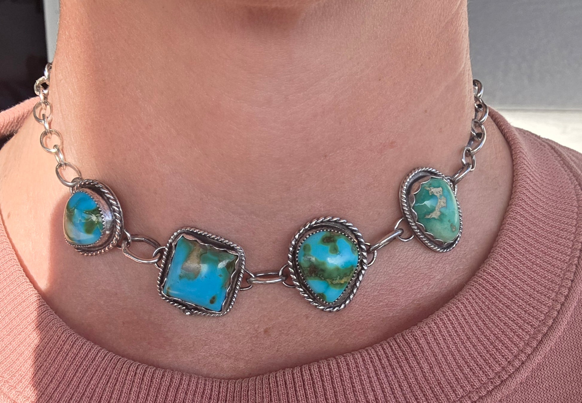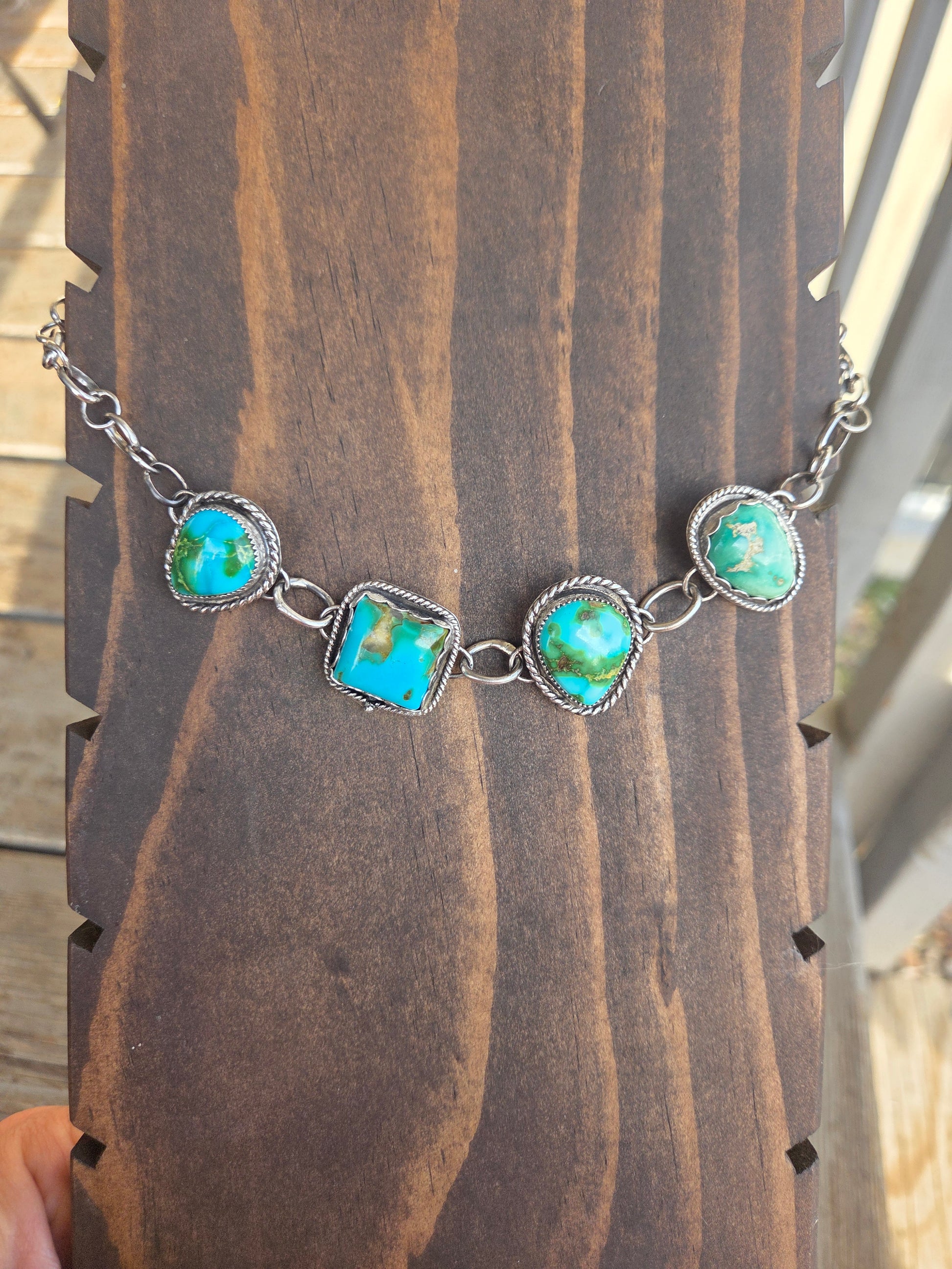 14.5 inches. Sonoran, kingsmen, Emerald Valley Turquoise. Priced dropped on this one since there are some flaws. On the Emerald Valley stone there is a small Crack where it meets the stabilize. See photo for reference.