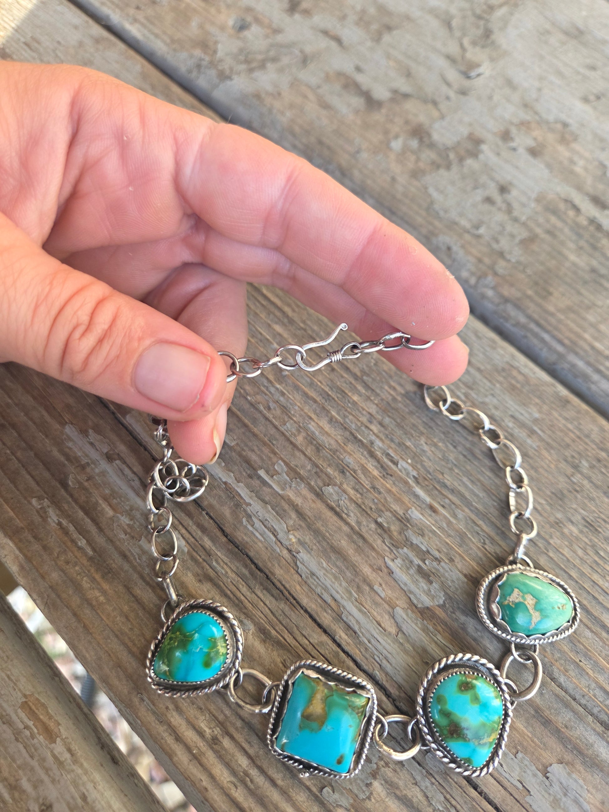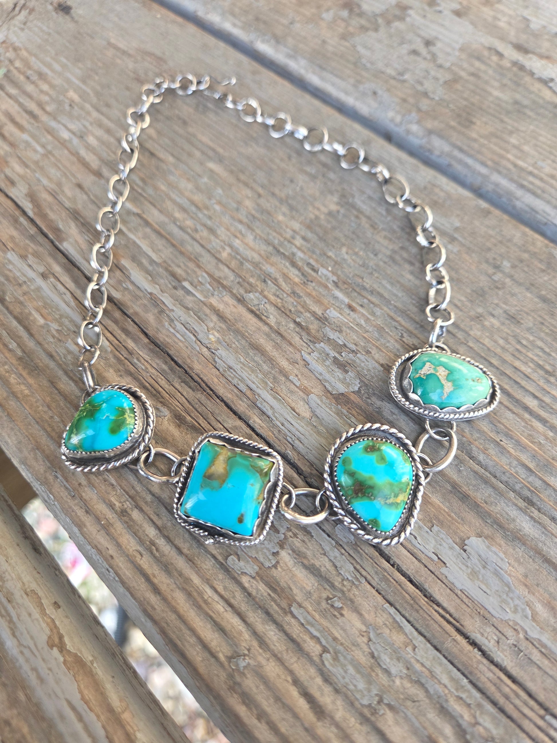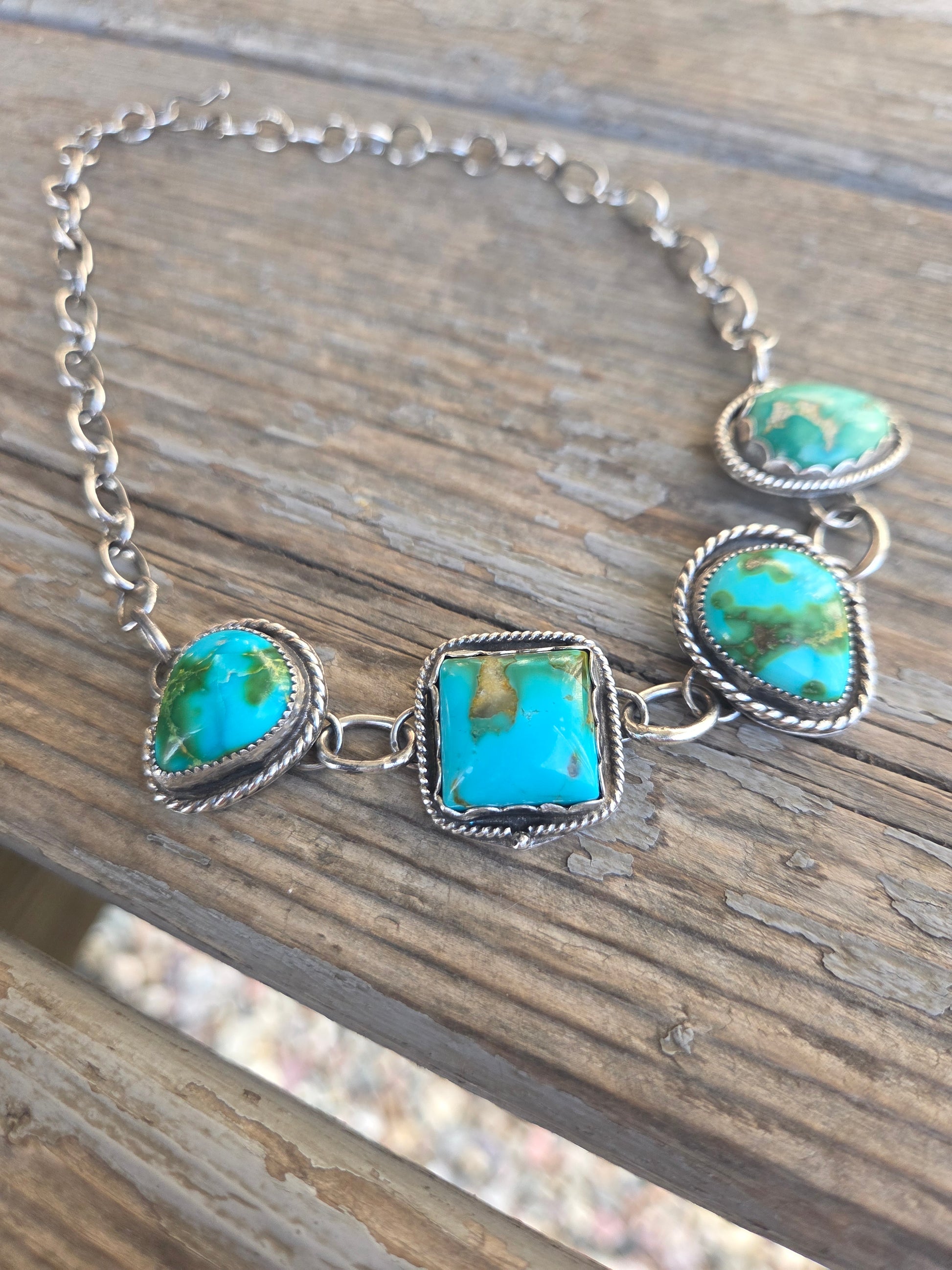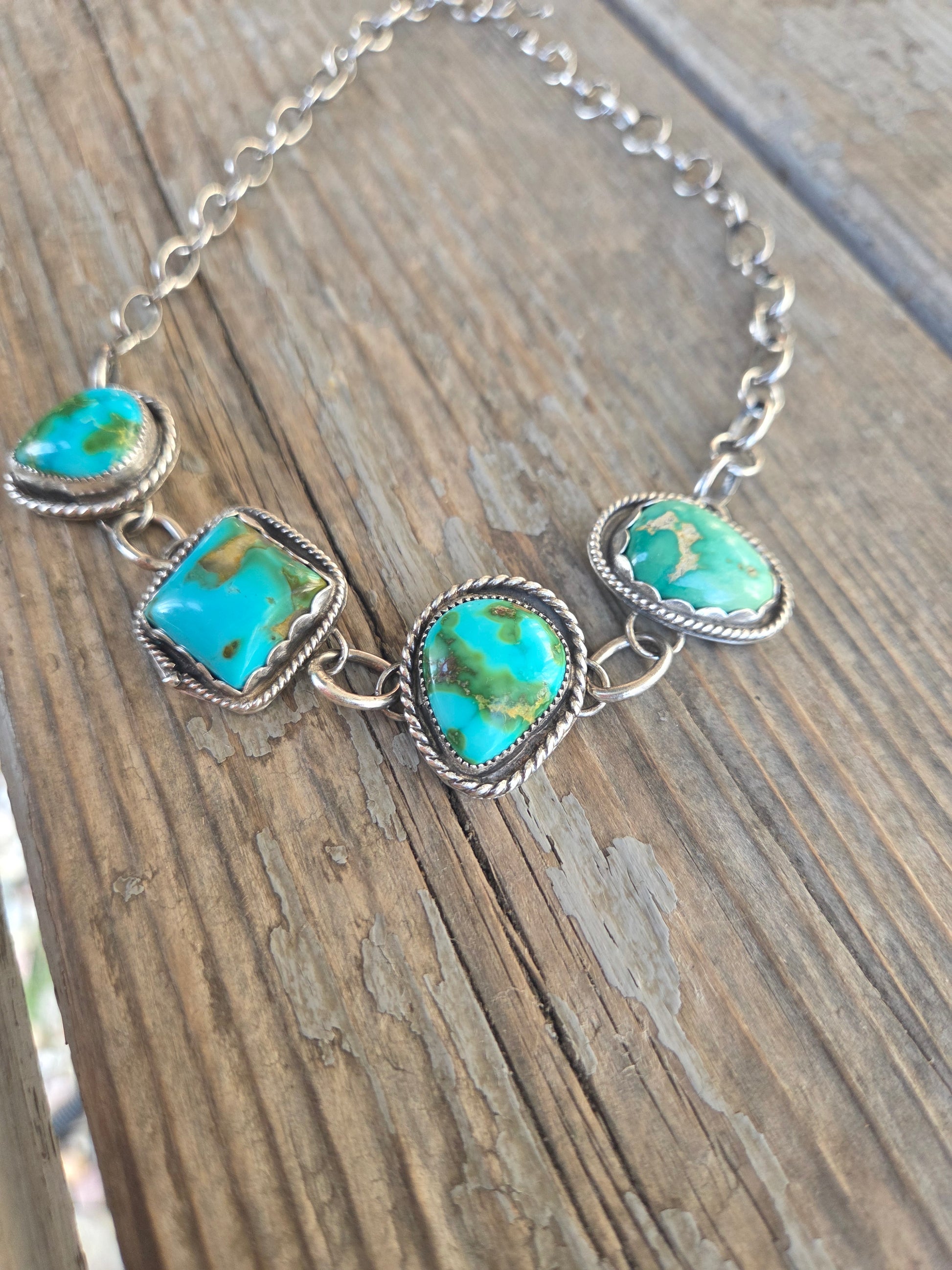 14.5 inches. Sonoran, kingsmen, Emerald Valley Turquoise. Priced dropped on this one since there are some flaws. On the Emerald Valley stone there is a small Crack where it meets the stabilize. See photo for reference.