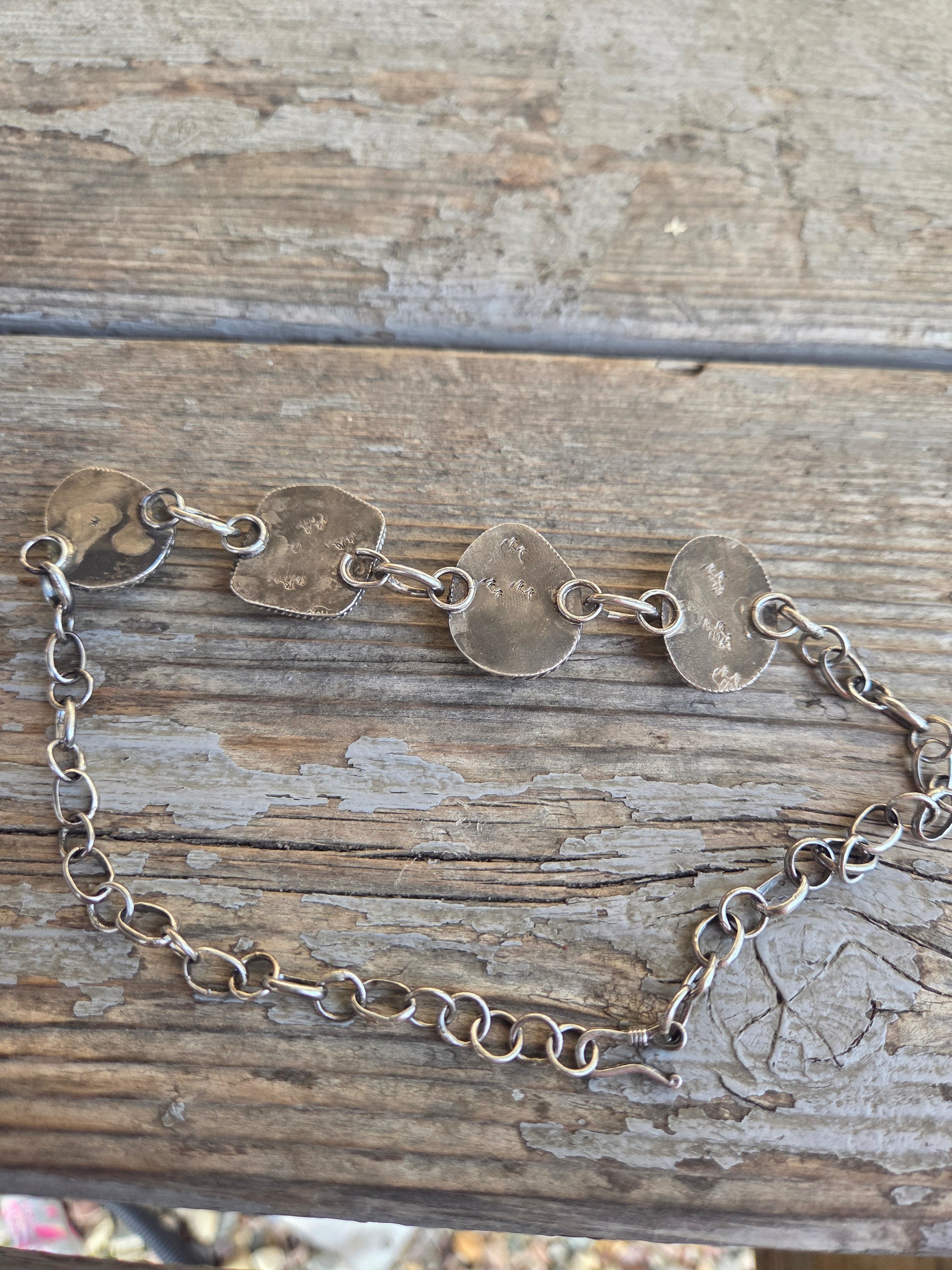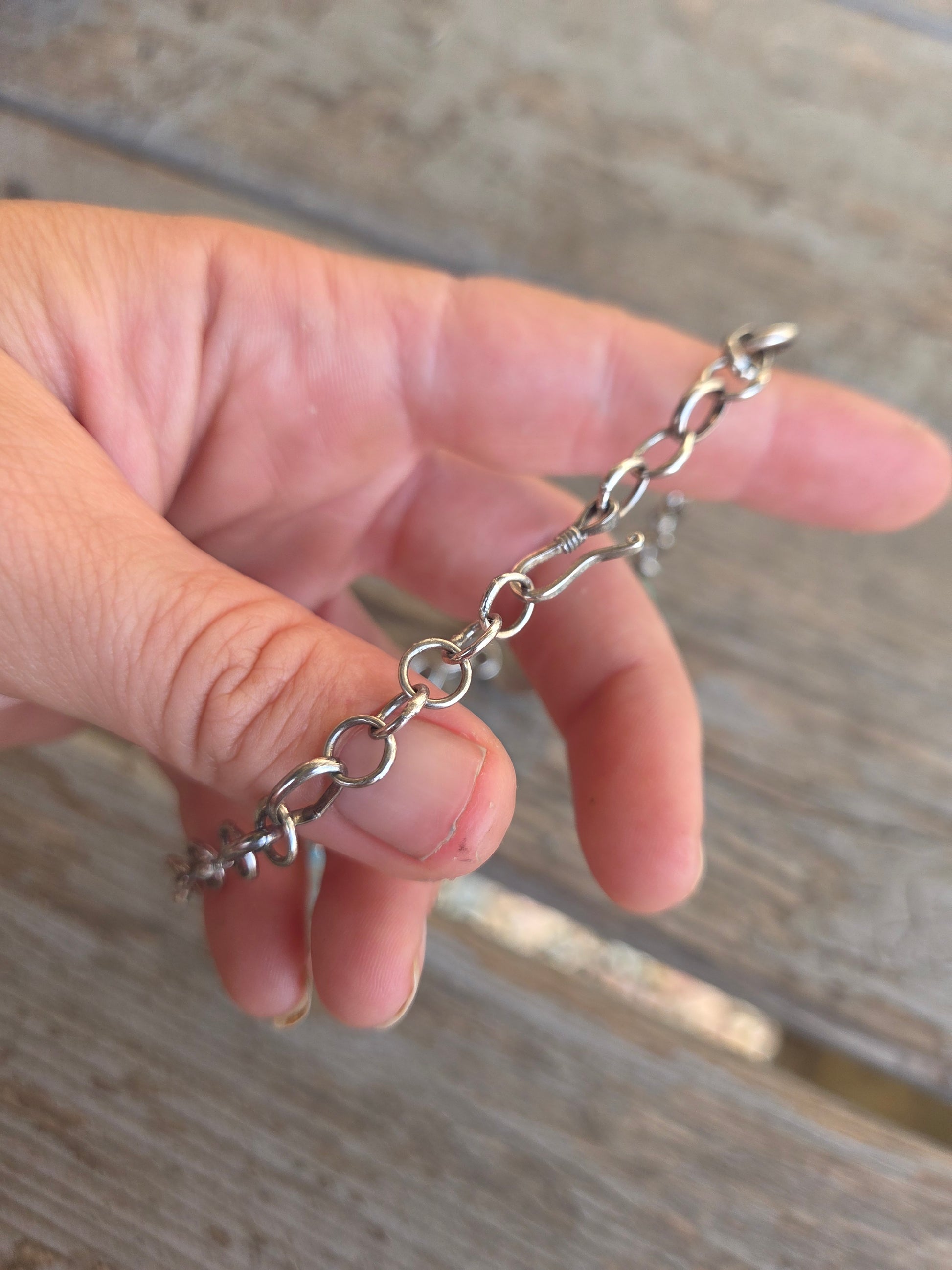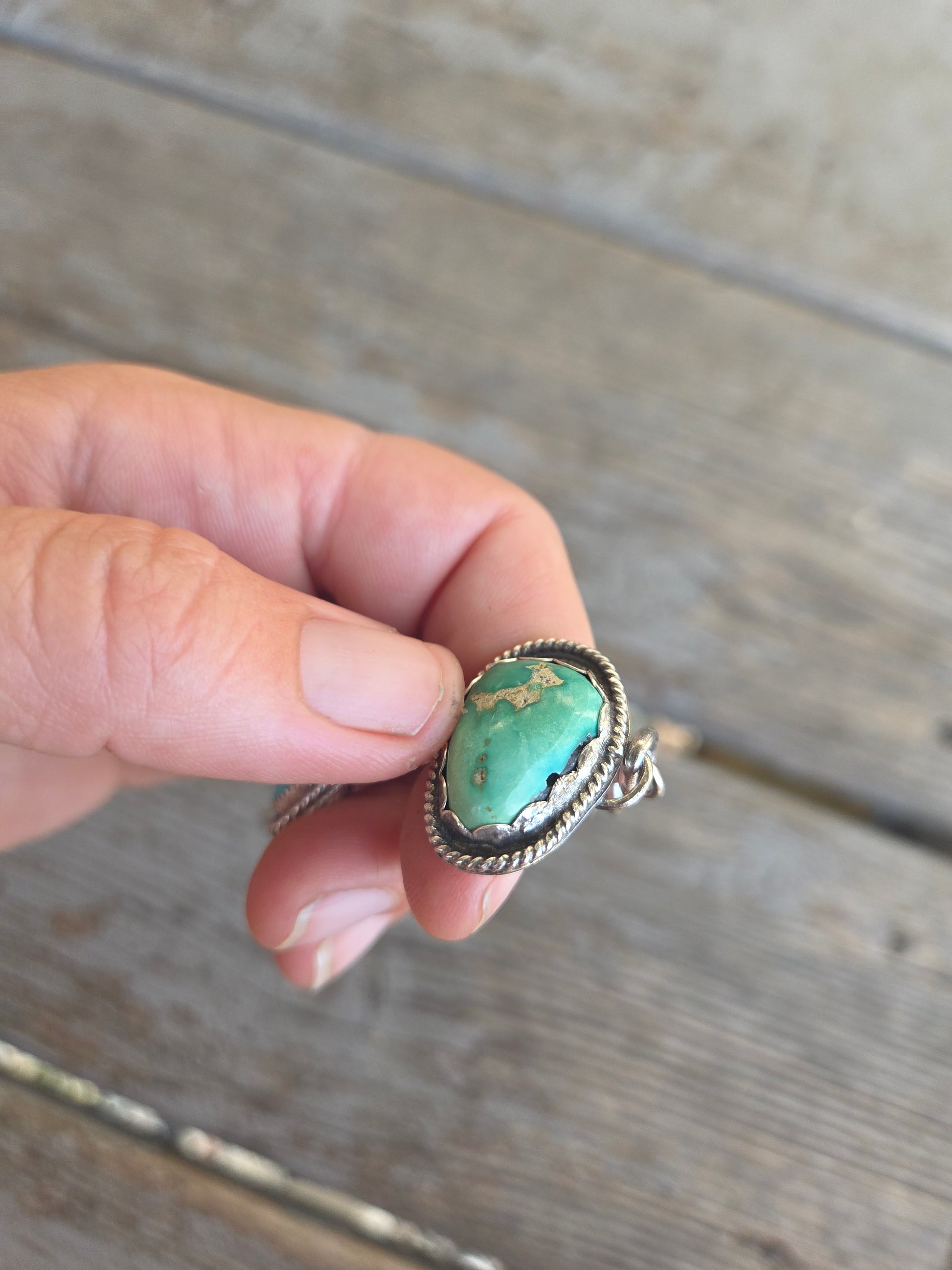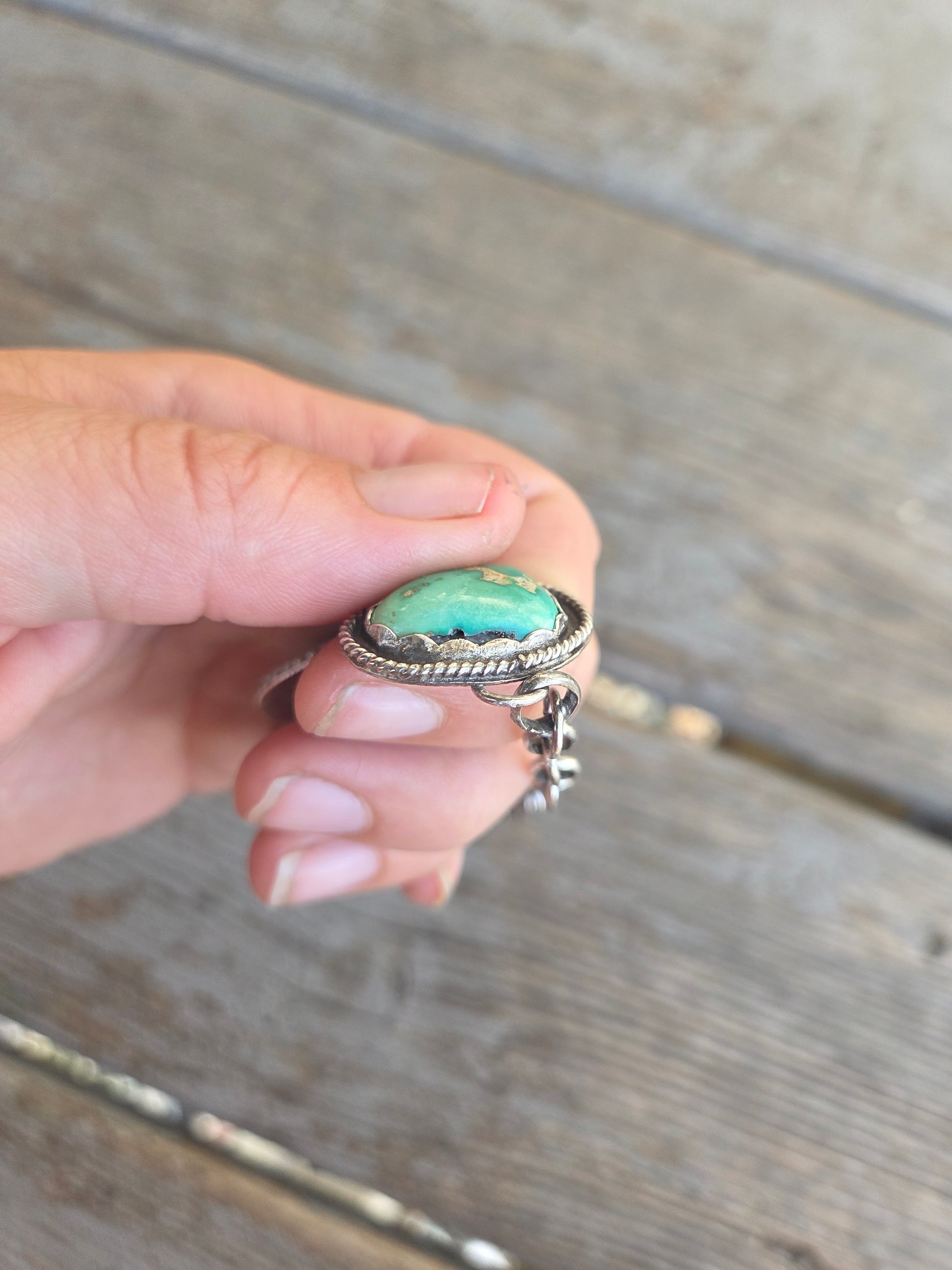 14.5 inches. Sonoran, kingsmen, Emerald Valley Turquoise. Priced dropped on this one since there are some flaws. On the Emerald Valley stone there is a small Crack where it meets the stabilize. See photo for reference.