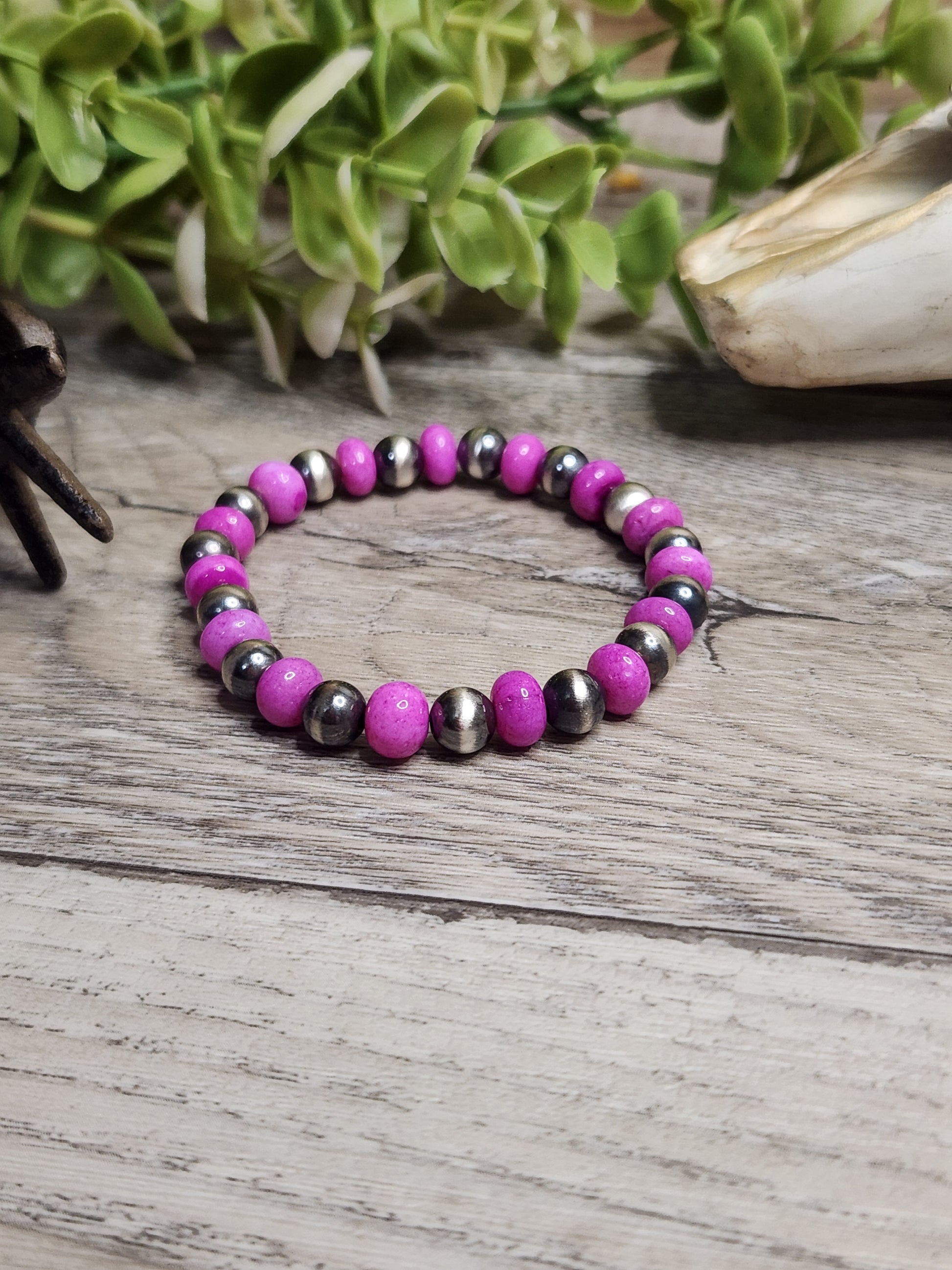 Dark Pink Opal & Sterling Silver Navajo Style Pearls Stretch bracelet