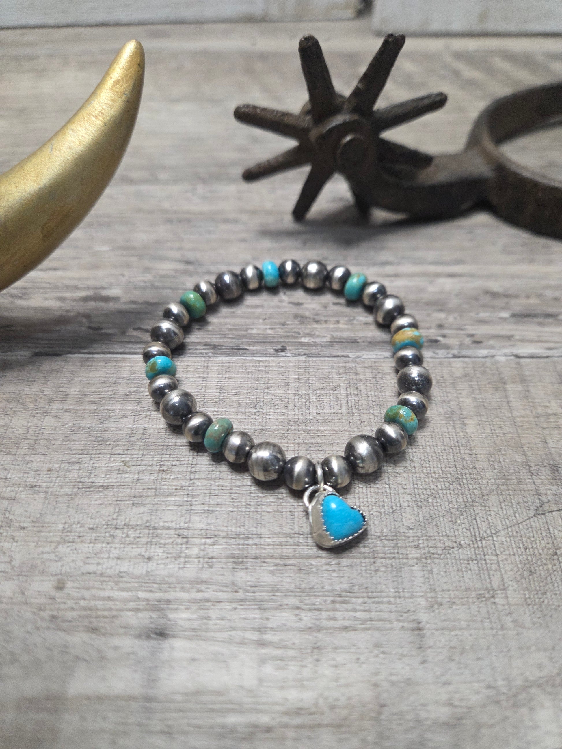 Kingsmen Turquoise Heart charm with Kingsmen Turquoise beads and Turquoise & Sterling Silver Navajo Style Pearls. Stretch Bracelet
