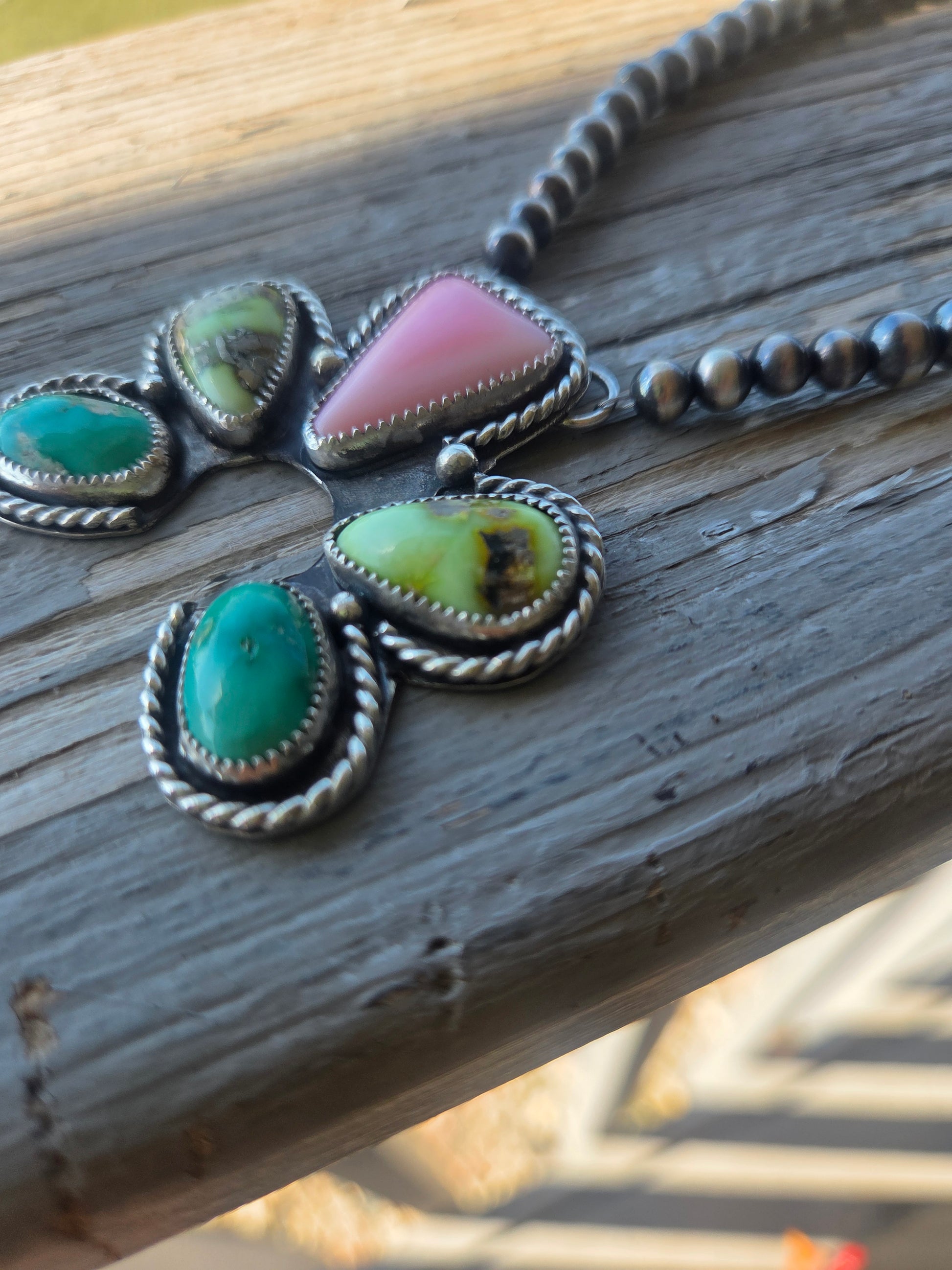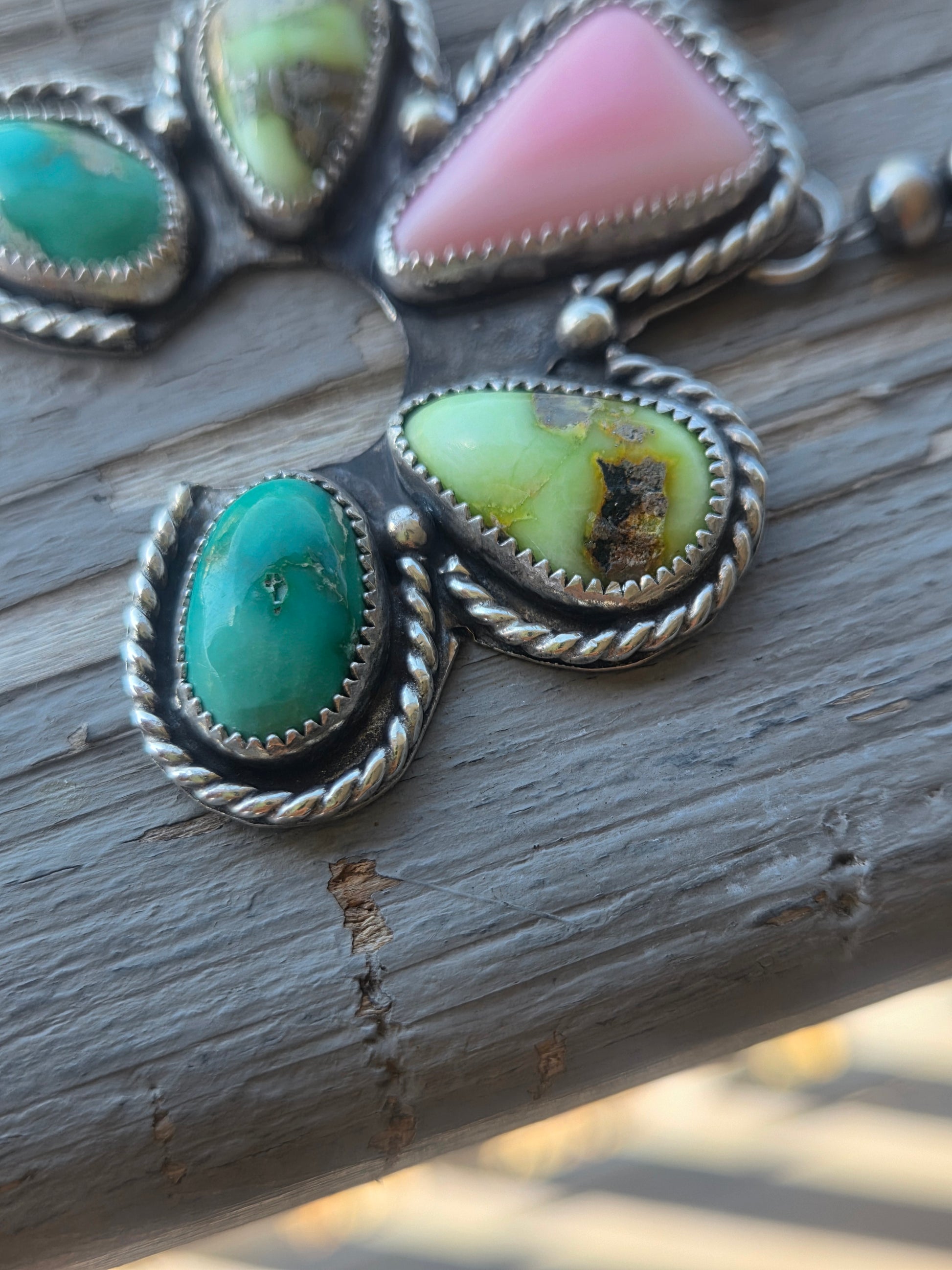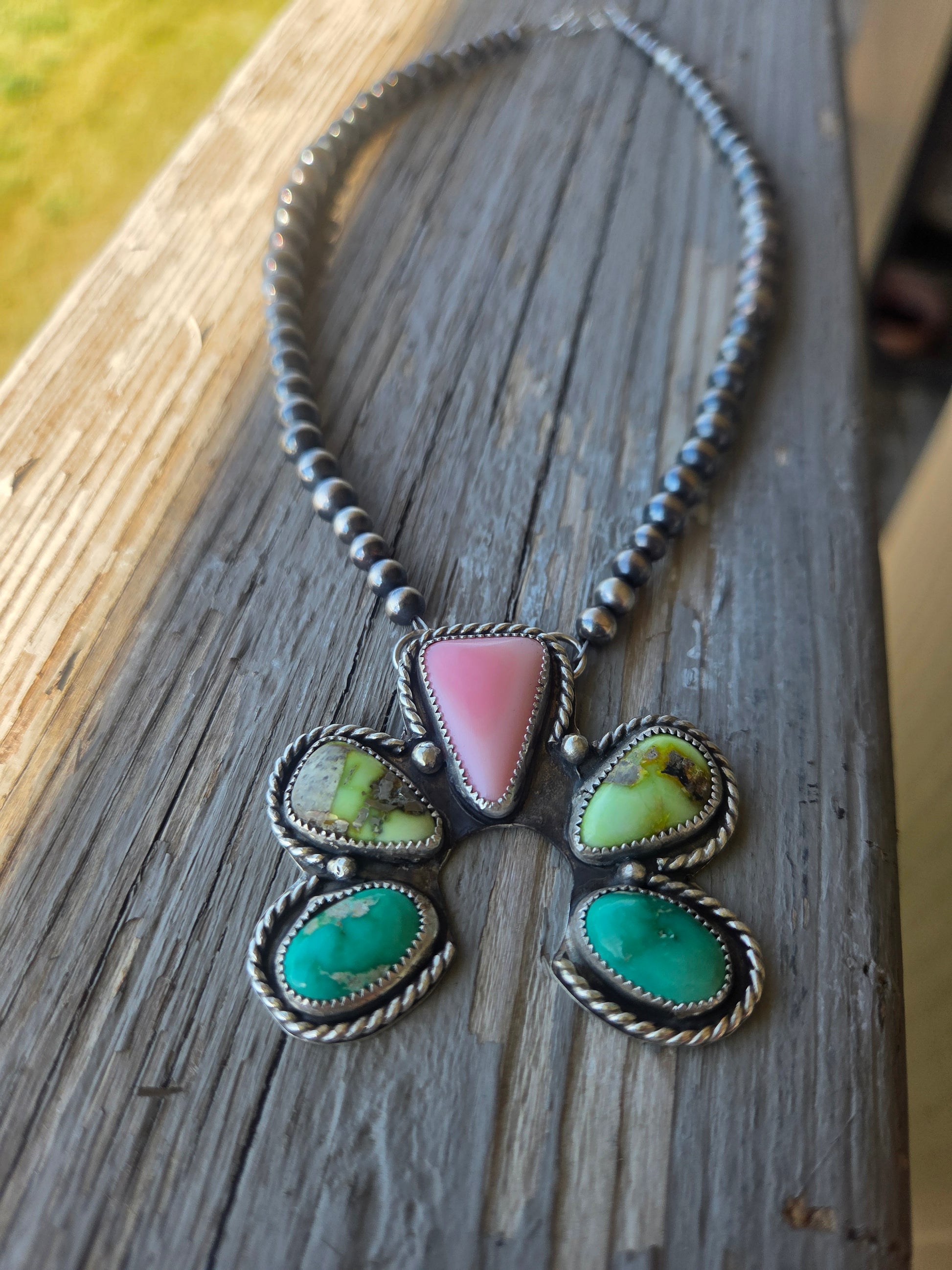 16 inches Pink Conch, Palomino, Emerald Valley. Note that there is a small chip in one of the Palomino stones. It's a little rougher not smooth.