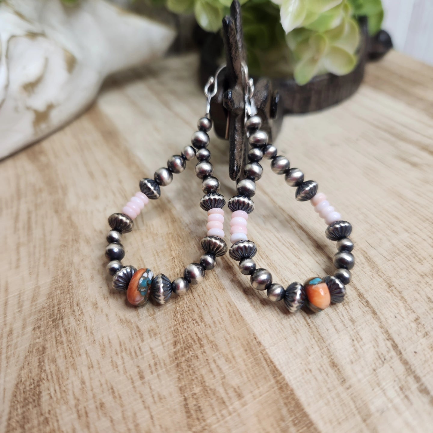 Pink Conch, Spiny Oyster Turquoise, & Sterling Silver Navajo Style Pearls 2 inch drop