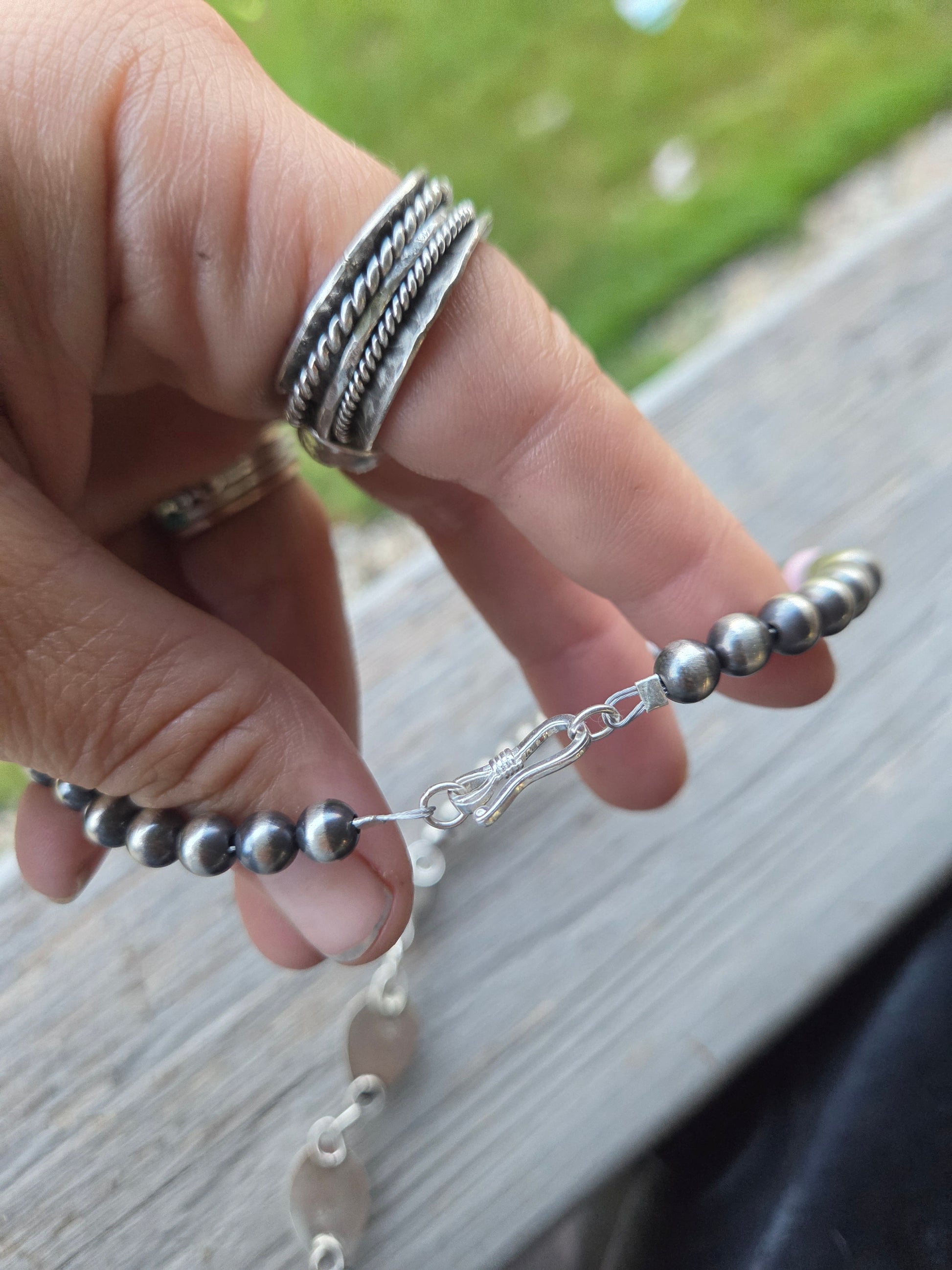 Pink Conch & Sterling Silver Navajo Style Pearls • Heart Pink Conch • Egyptian Turquoise 16 inches