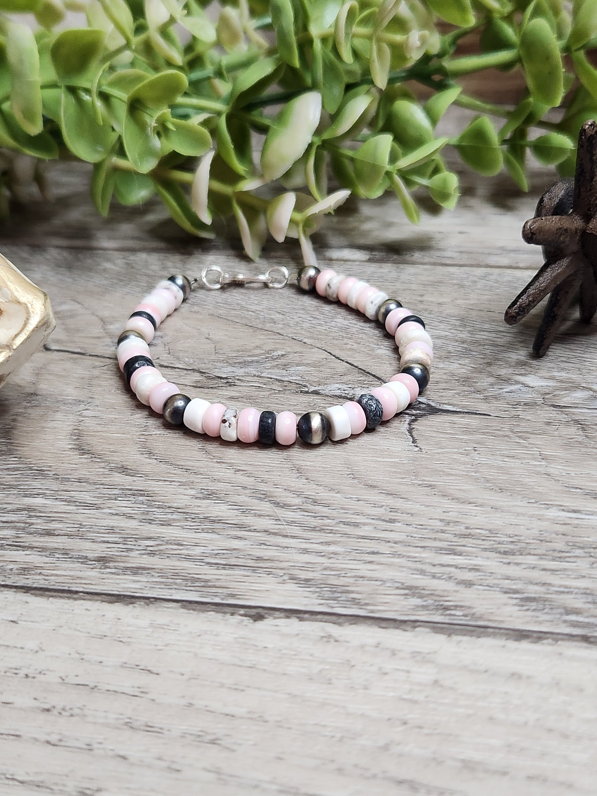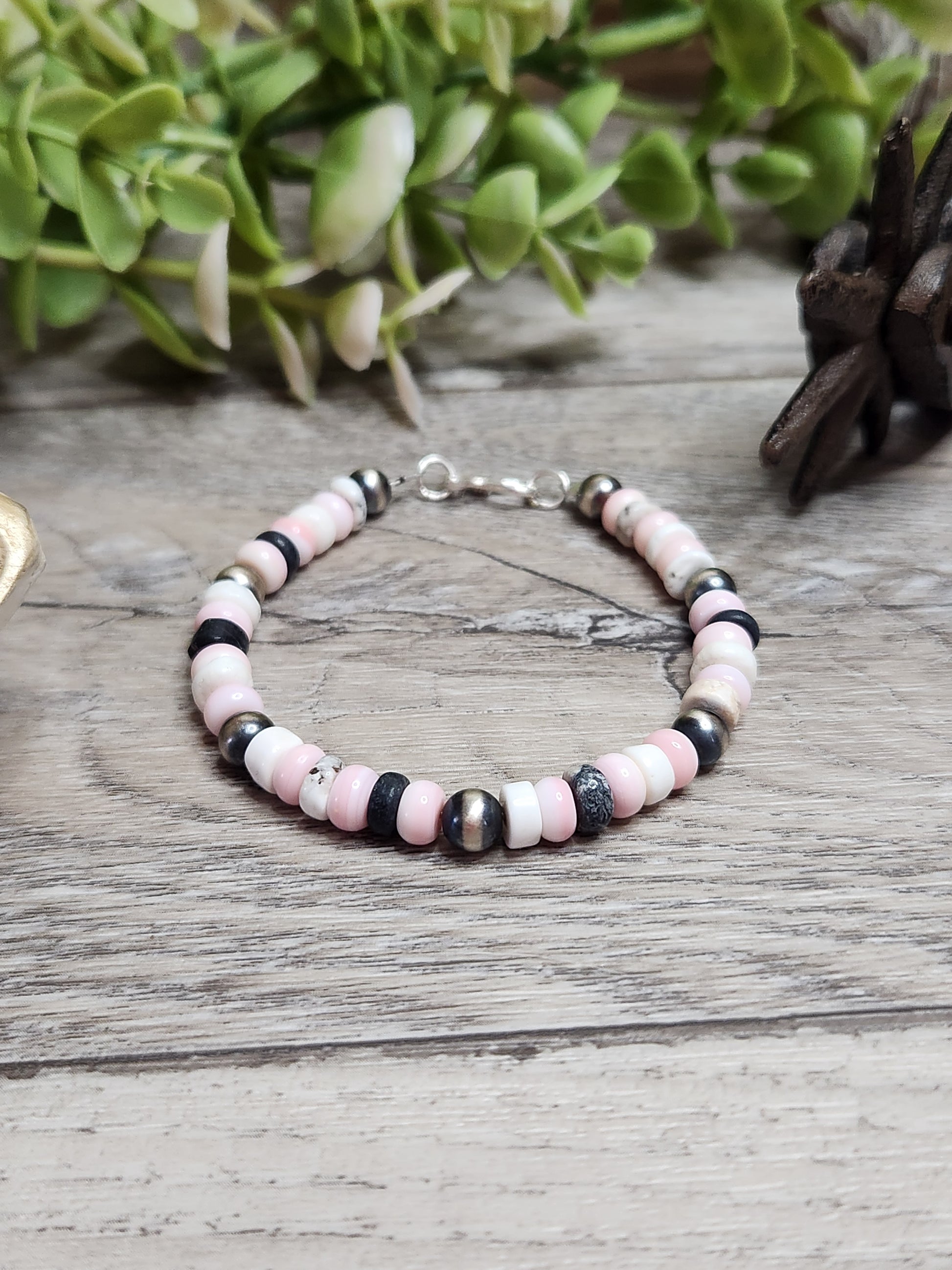 Pink Conch, White Buffalo,& Sterling Silver Navajo Style Pearls. Clasp