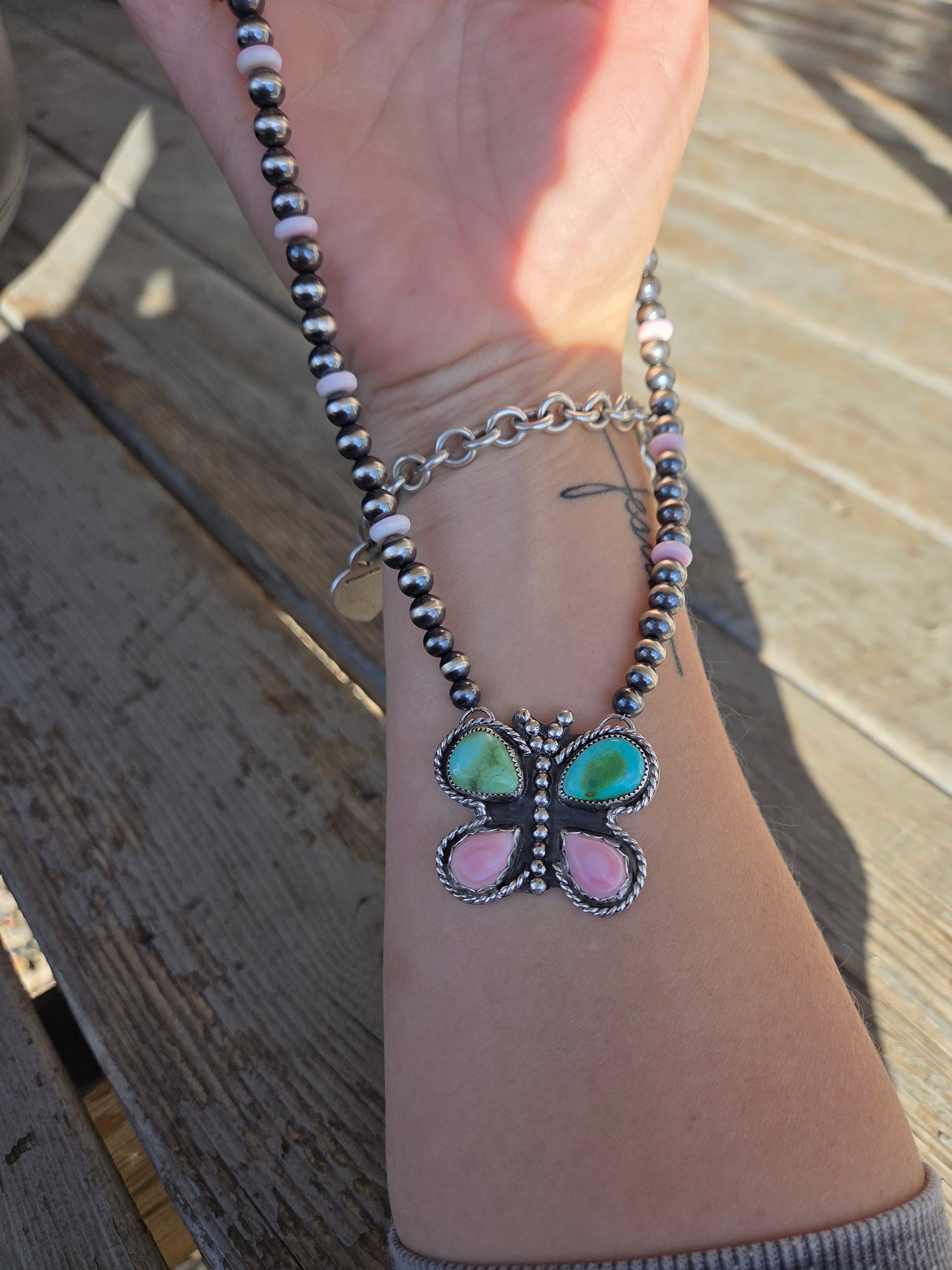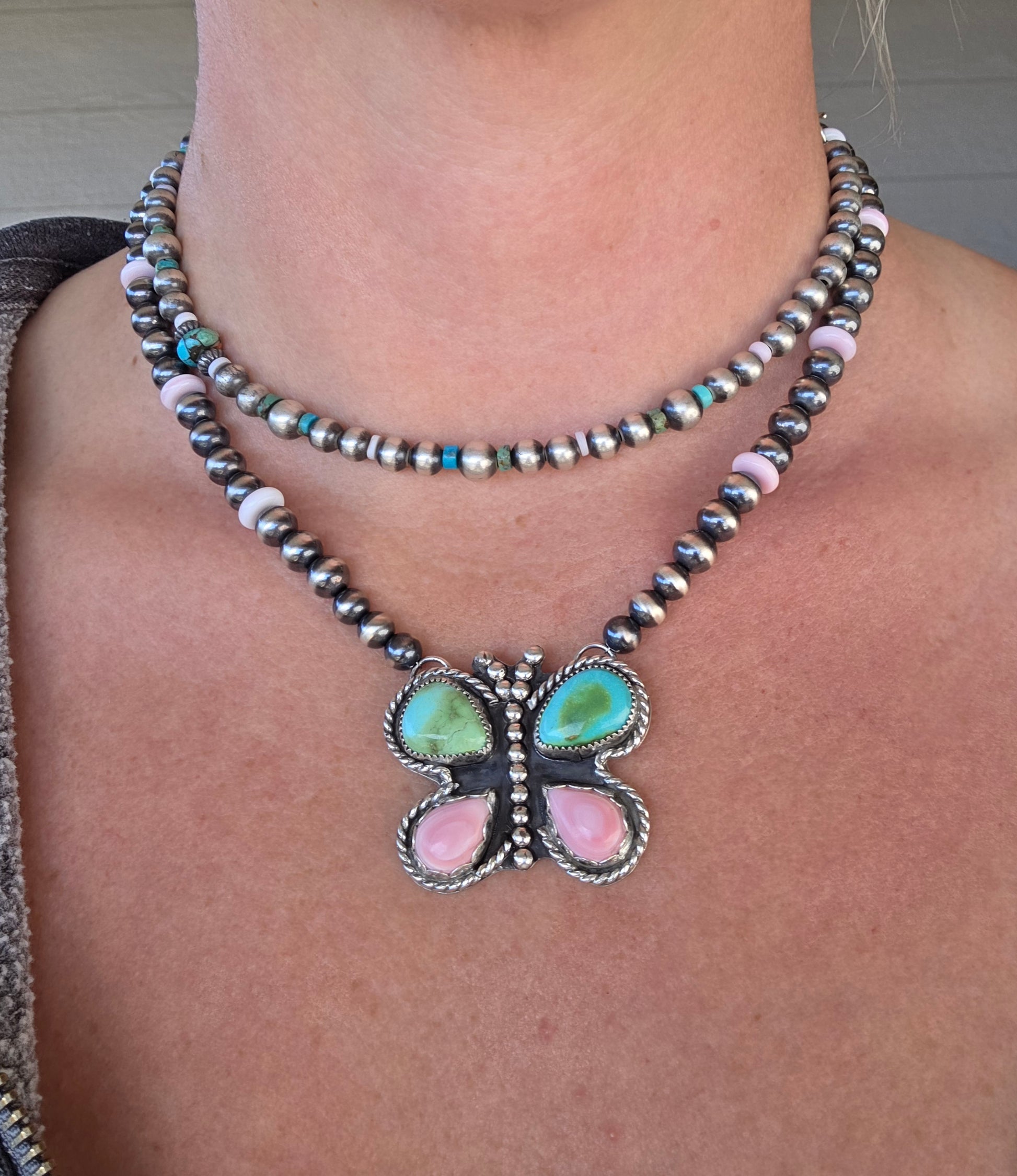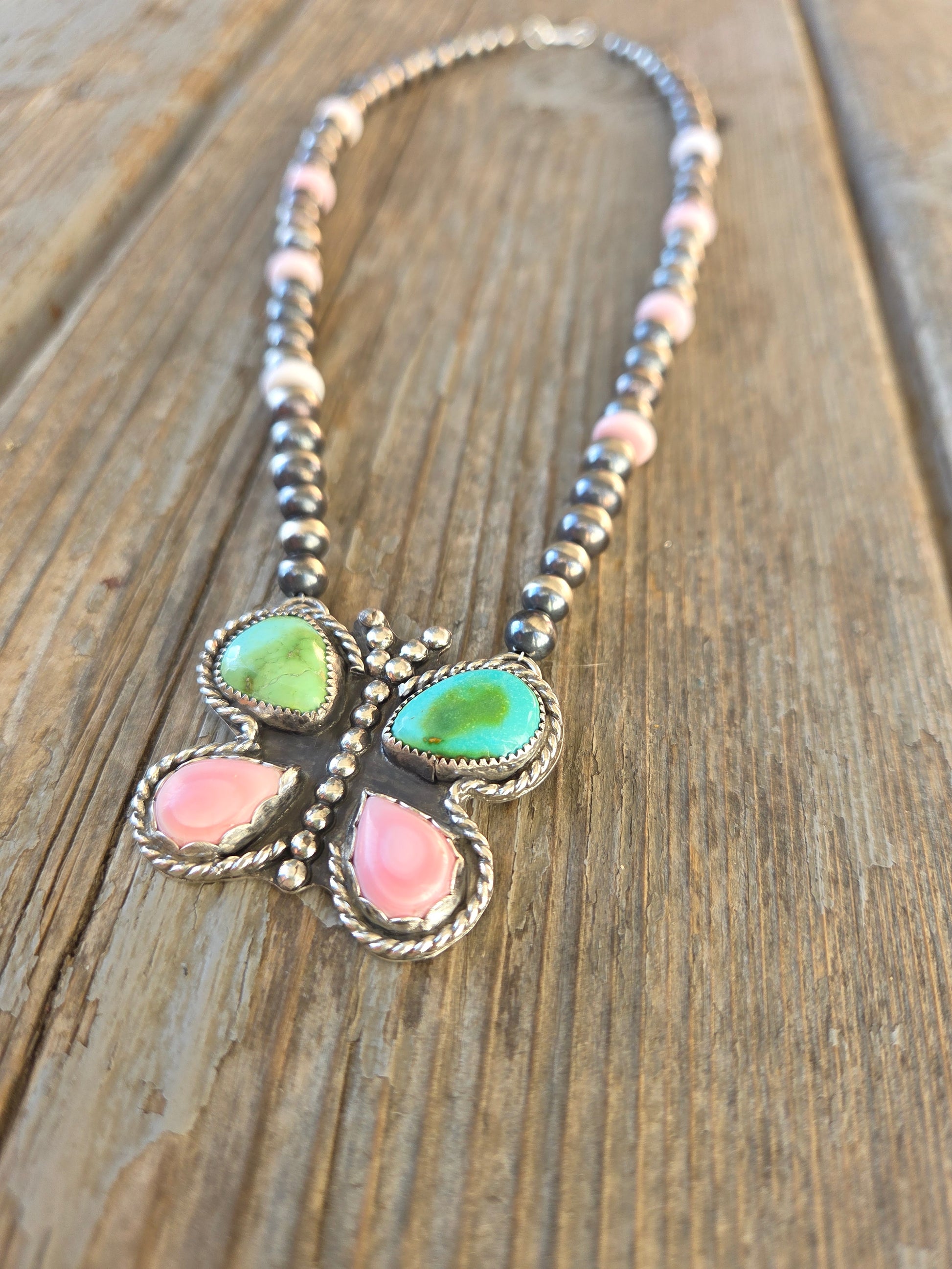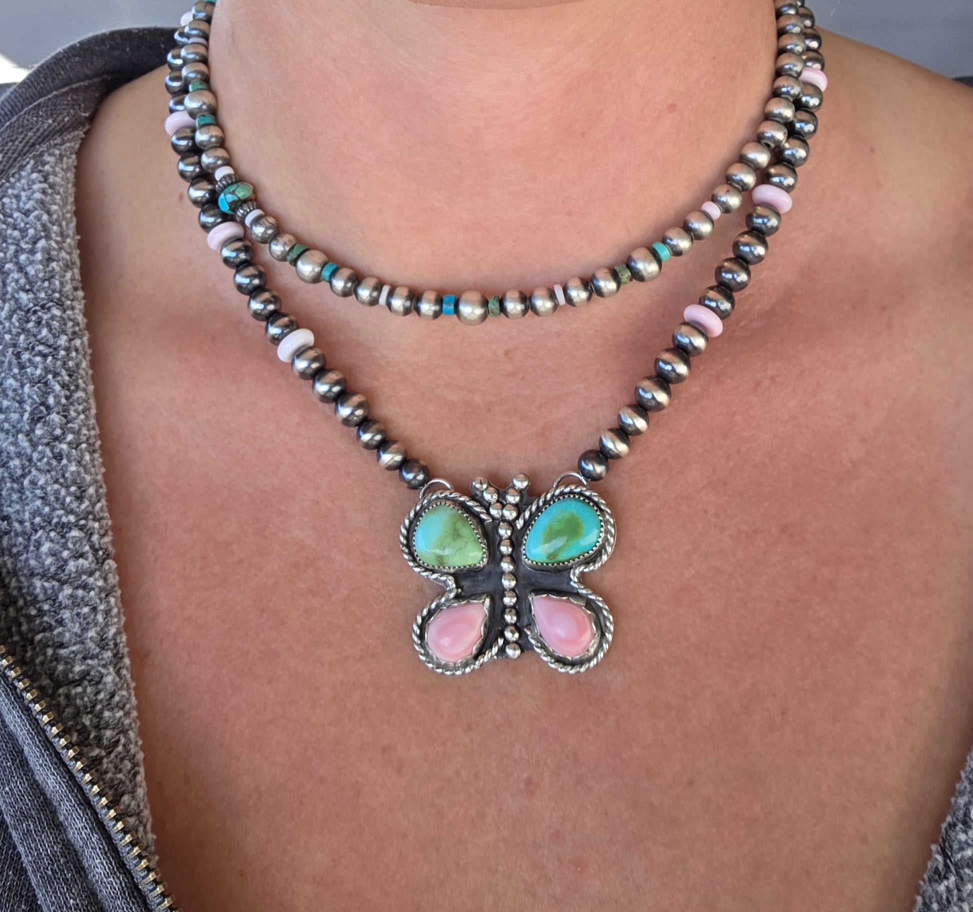 Pink & Sonoran Turquoise. Sterling and Pink Conch Stone beads. 17.5 inches