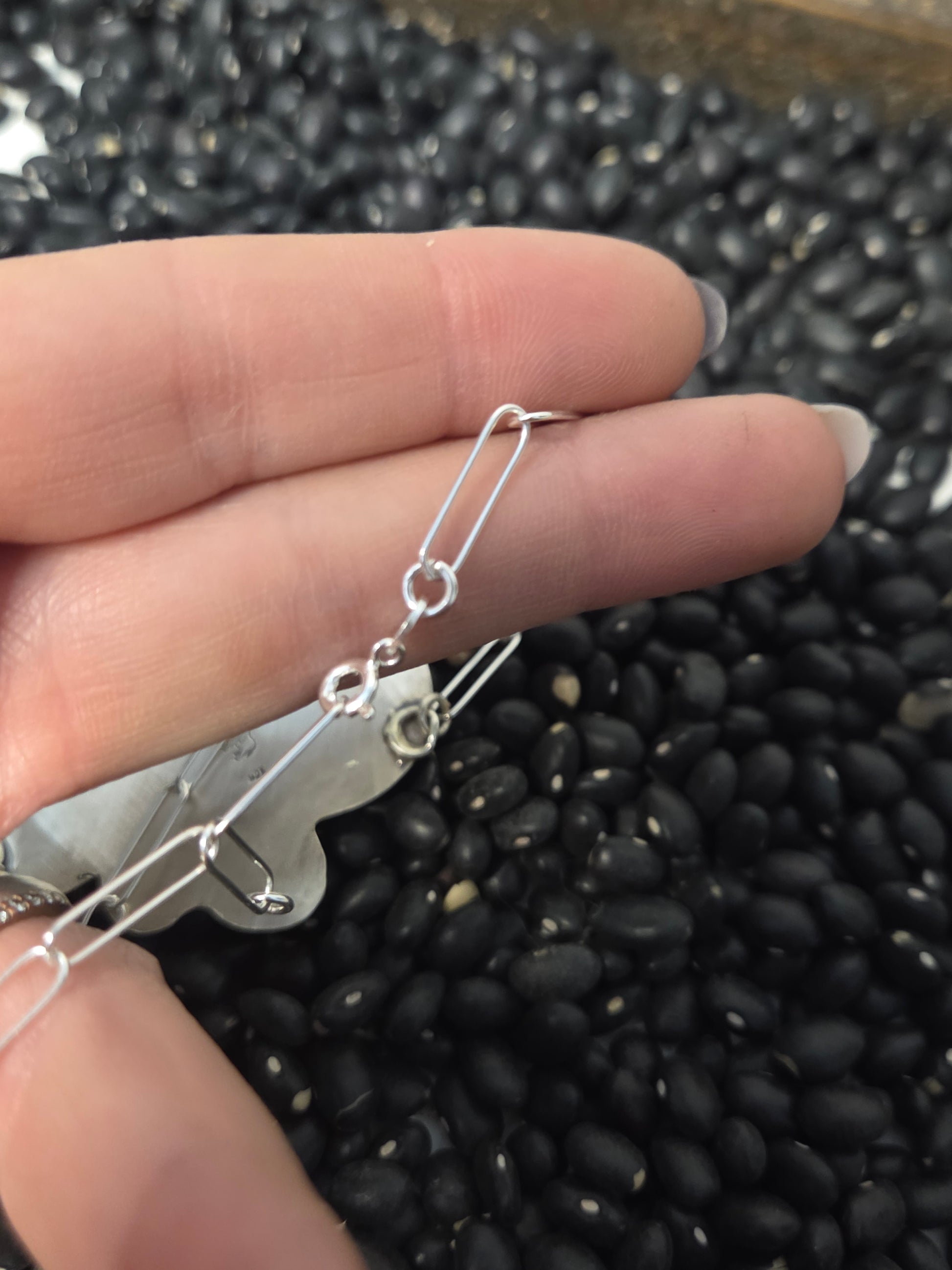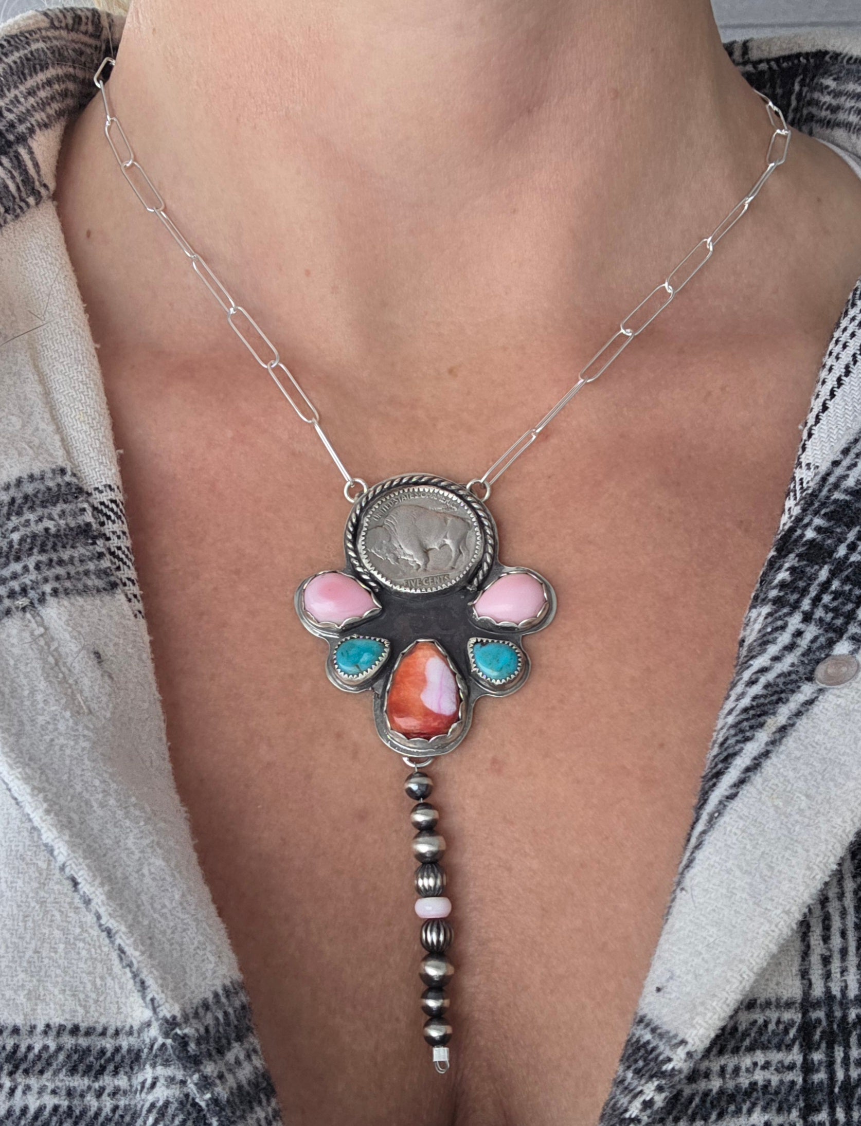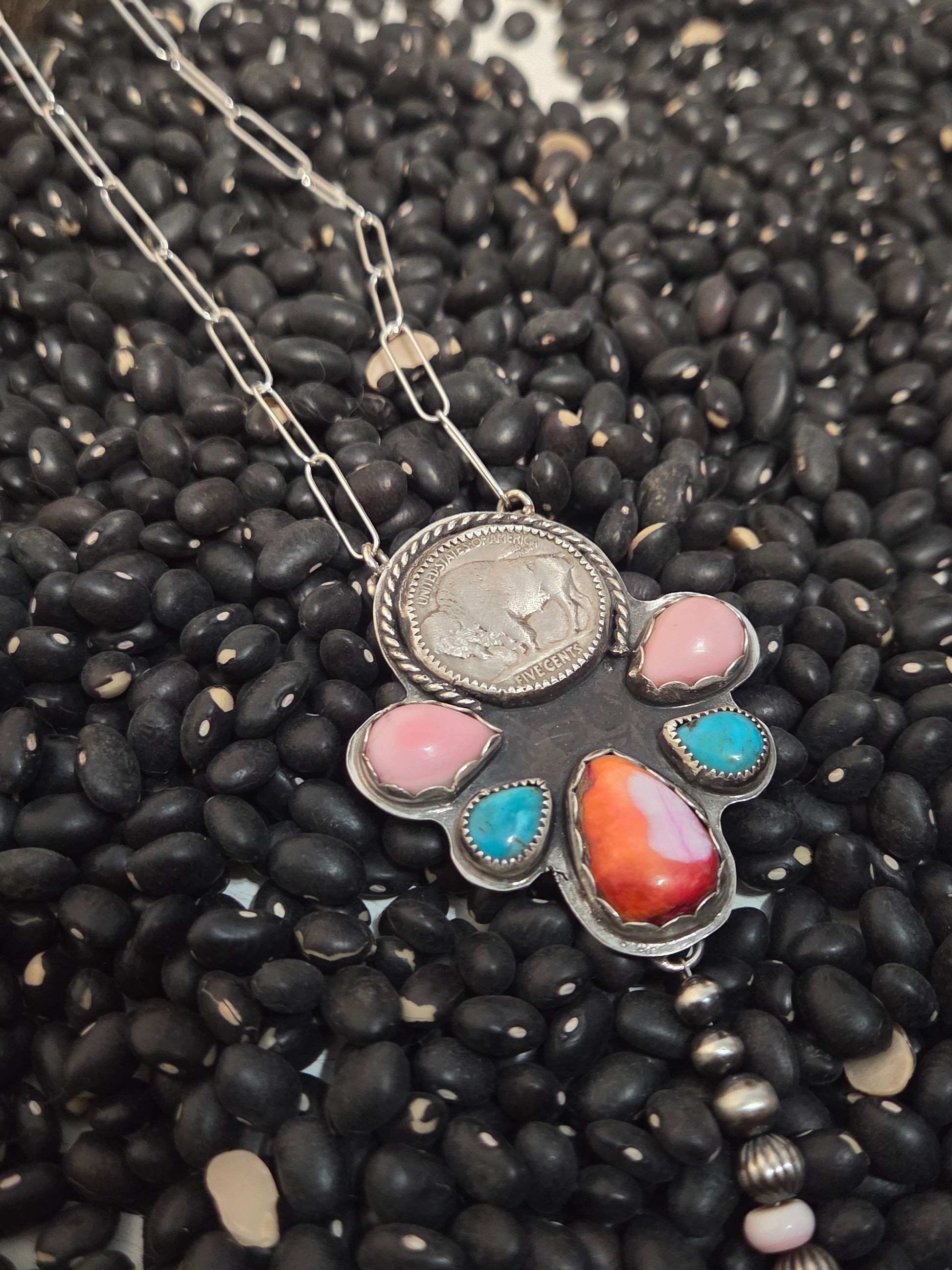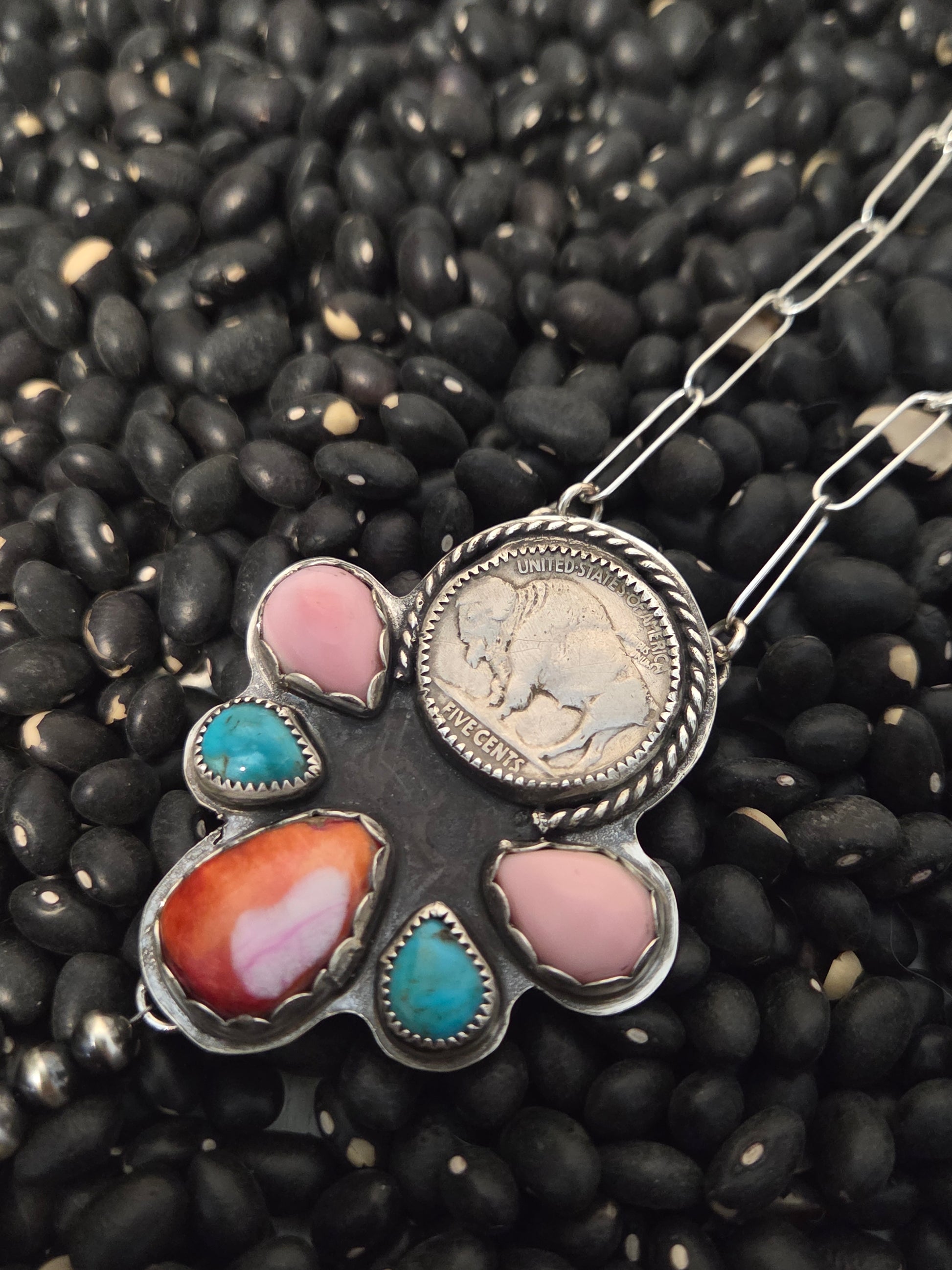 Buffalo Coin•Pink Spiny• Kingsmen Turquoise • Pink Conch with sterling pearls. 18 inches-adjustable chain