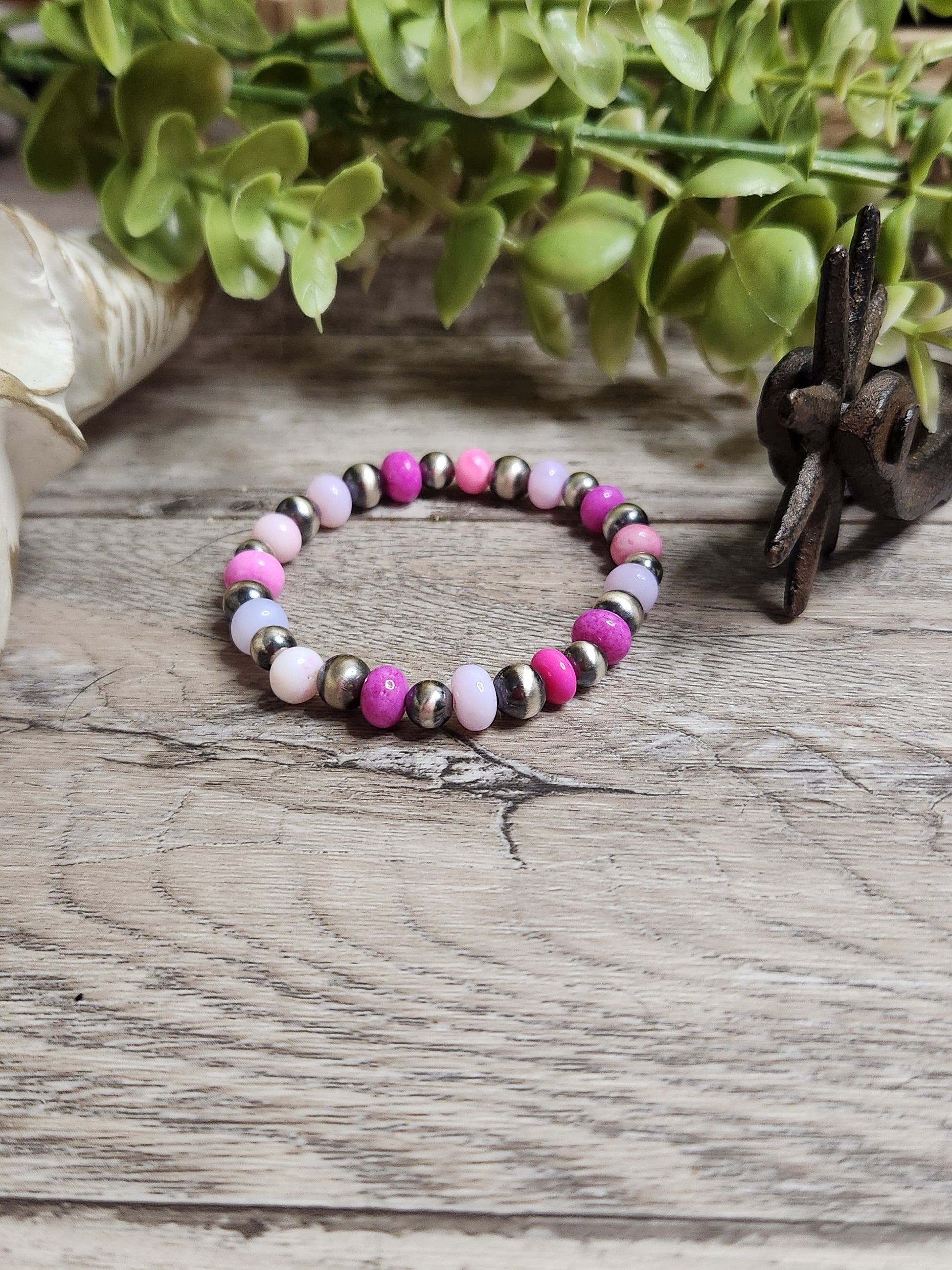 Purple & Pink Opal & Sterling Silver Navajo Style Pearls. Stretch Bracelet