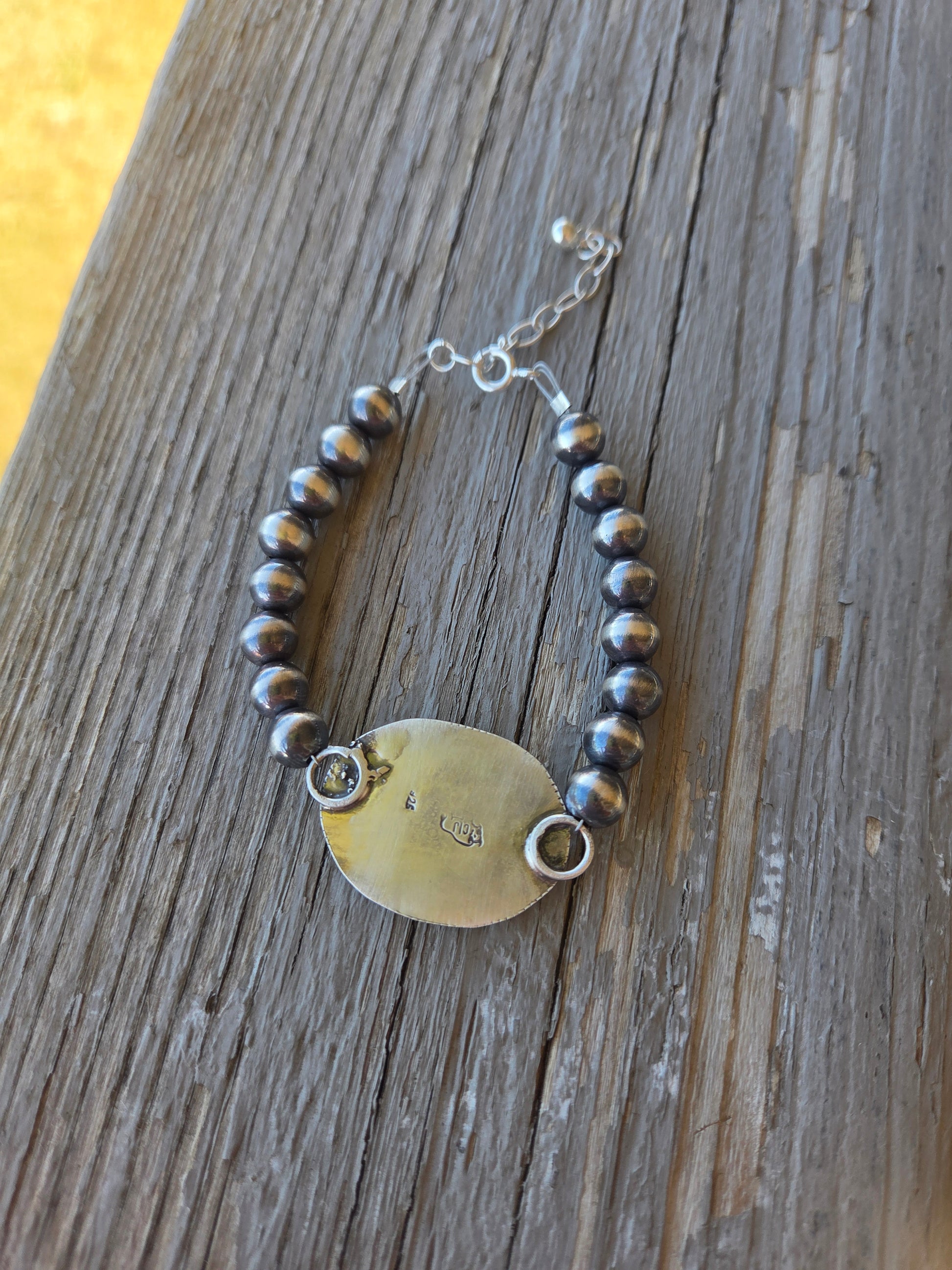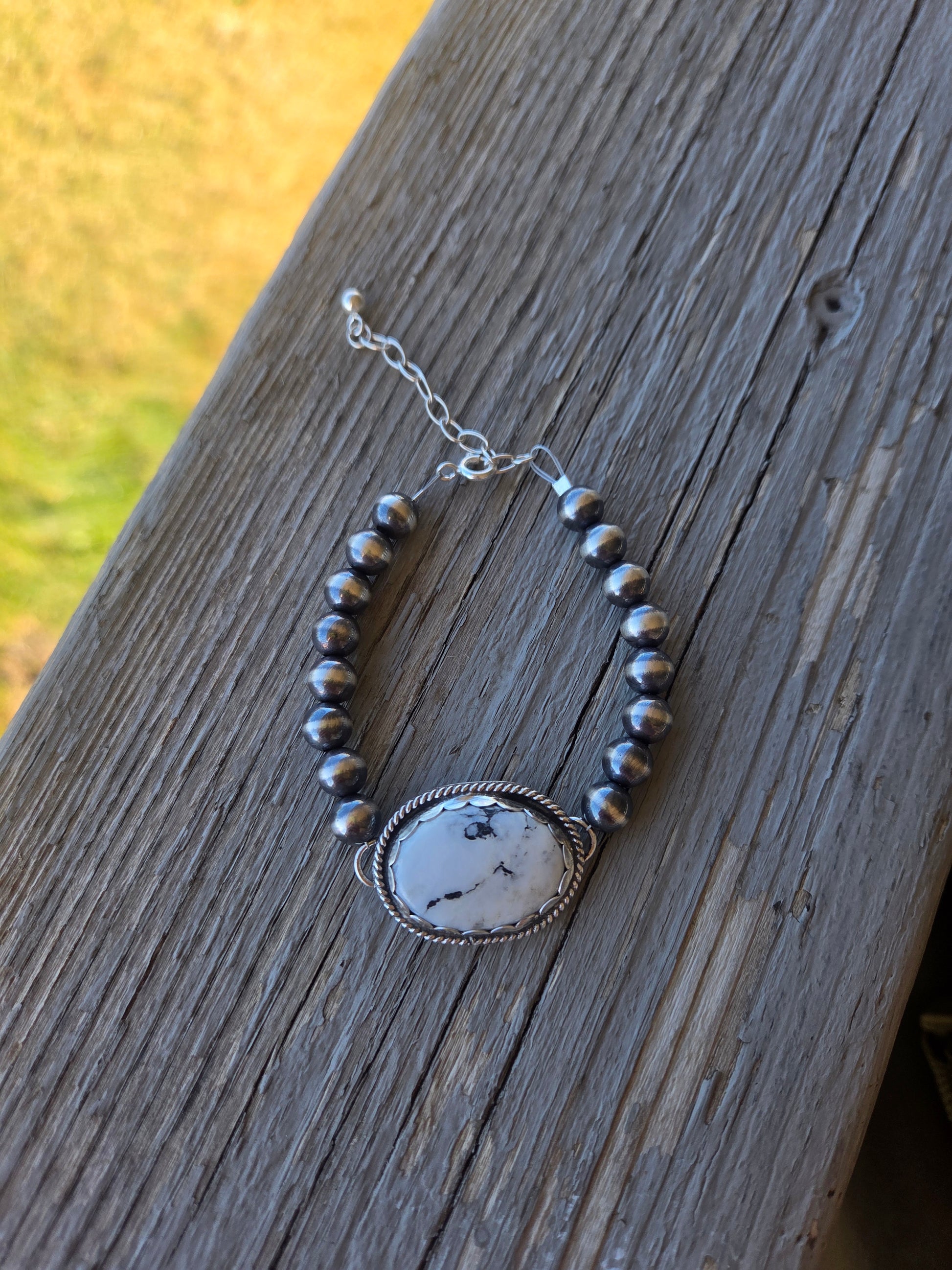 White Buffalo •Sterling Silver Navajo Style Pearl • Turquoise Sterling Silver Adjustable clasp. fits size 6-8